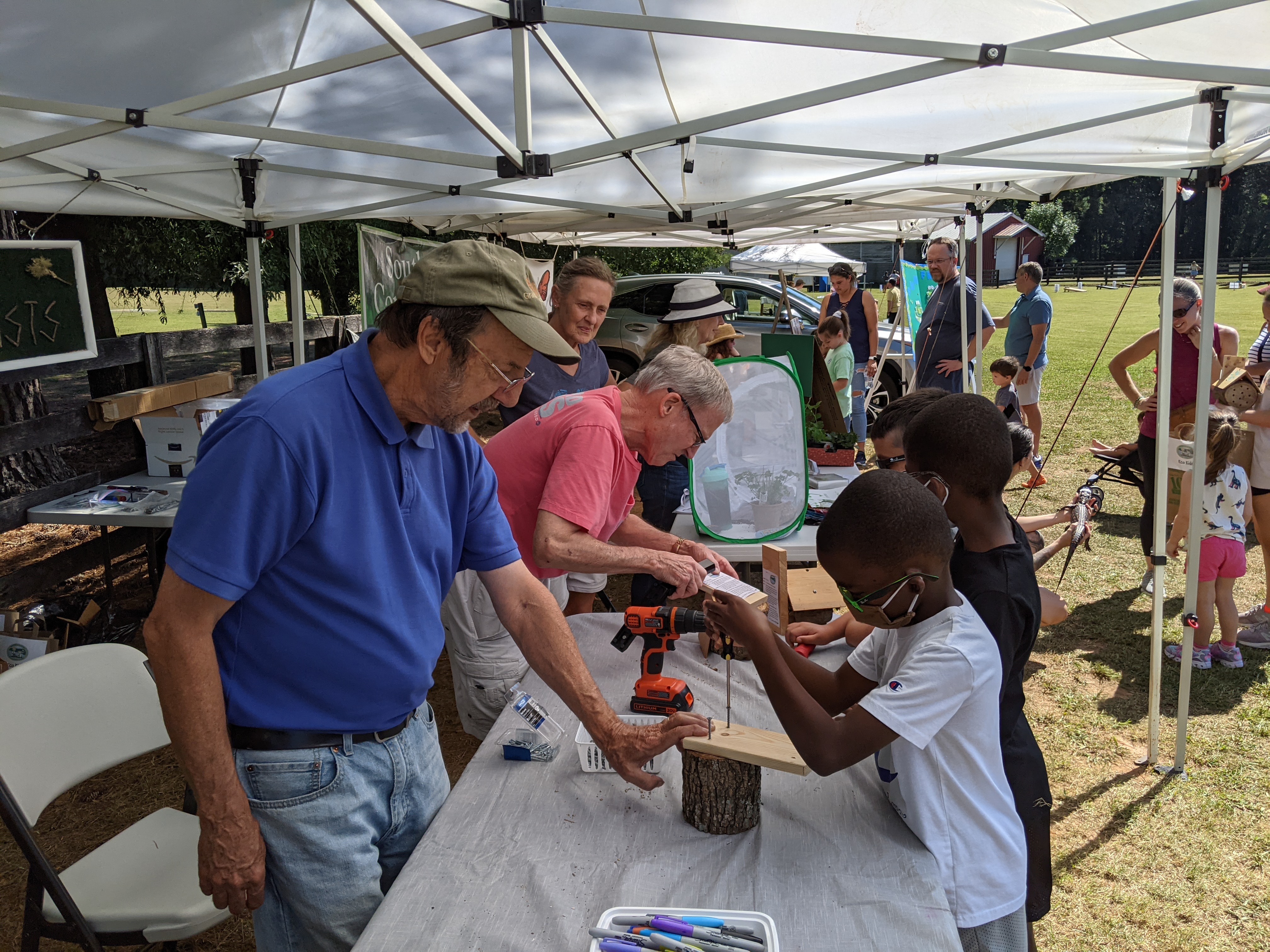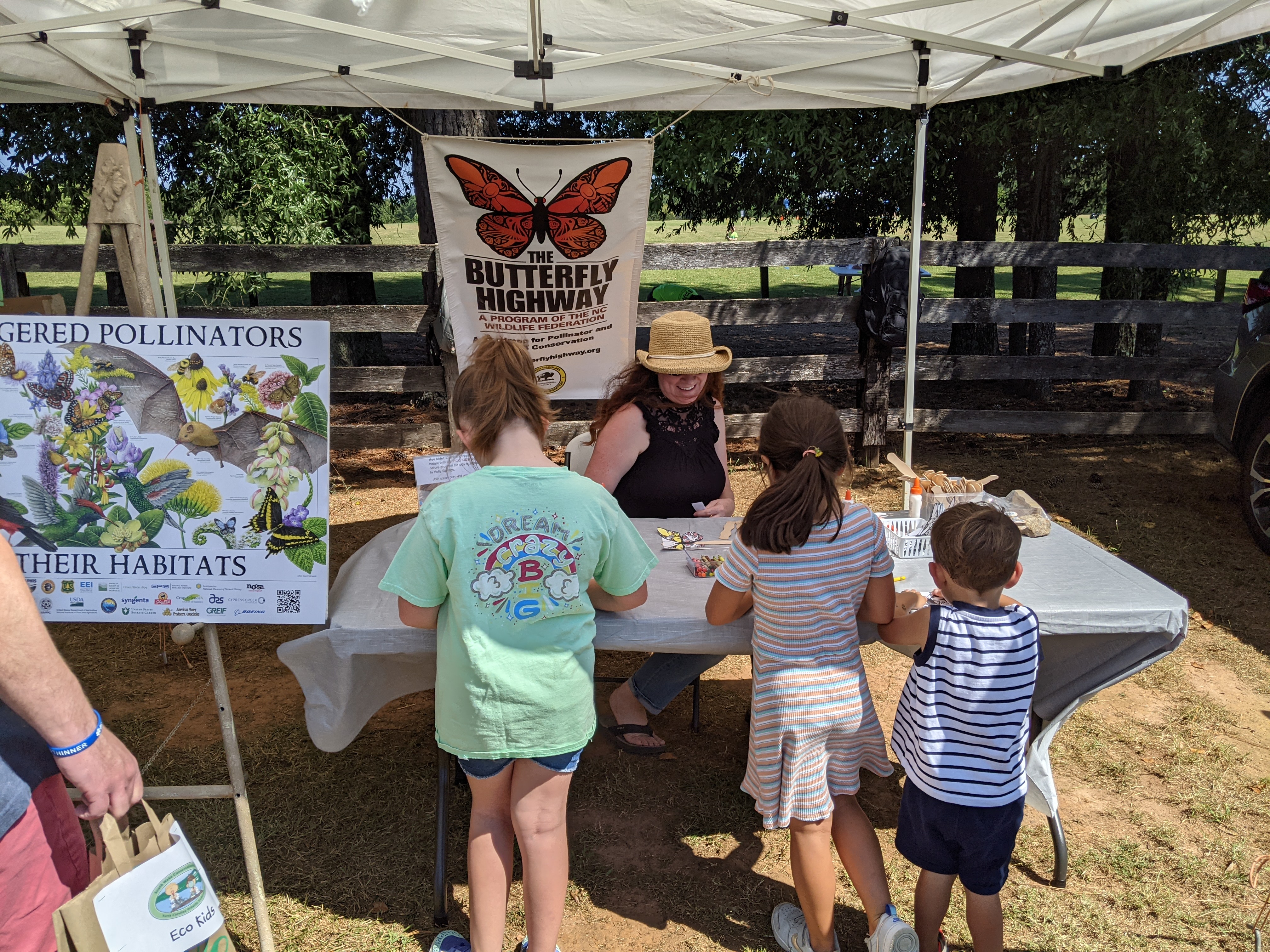 What a beautiful day for a festival! Our Community Engagement and Eco Kids Committees had a great time engaging with kids and adults in the Holly Springs area at this fun annual festival held at Sugg Farm, with sunny skies and temps in the low eighties. There were lines of eager children formed to get to the various activities we offered, including bee hotel builds, butterfly fan construction and coloring, pollinator matching board, frog facts board, and 20 questions about animals and plants in NC. Plus pollinator seed packets and nature-print bags for donations. We had a dedicated crew of member volunteers working the stations, and everyone had a great time.