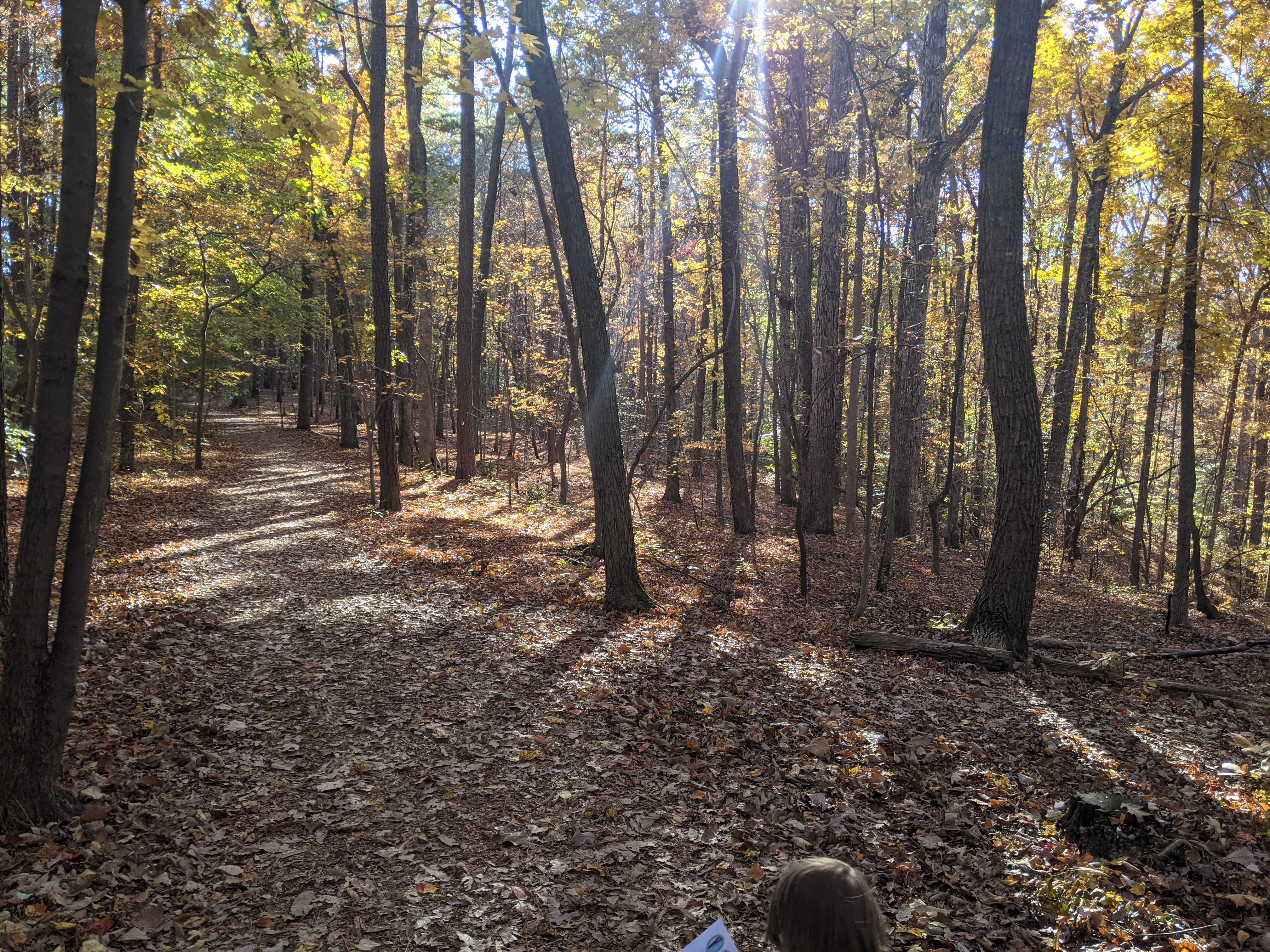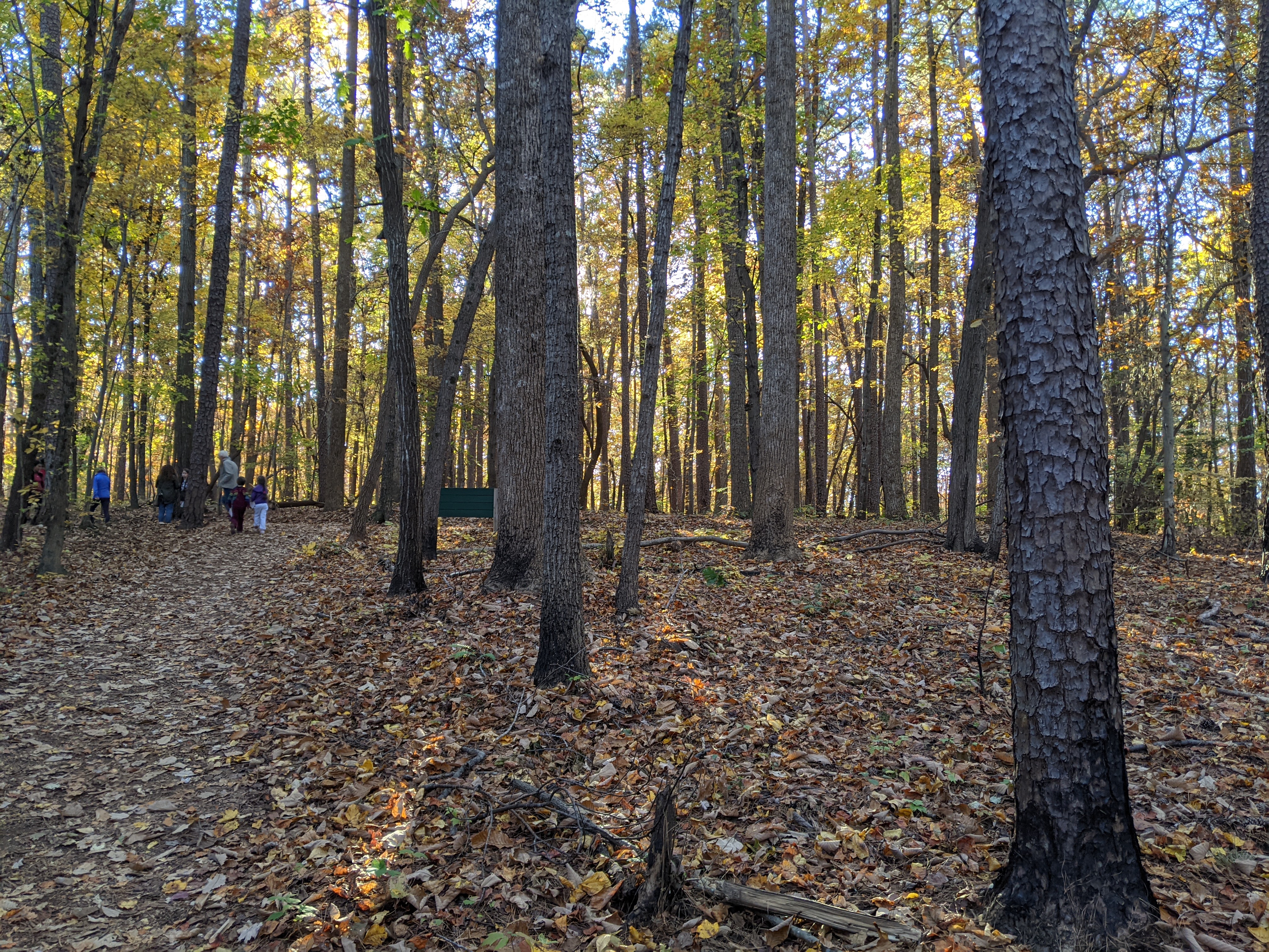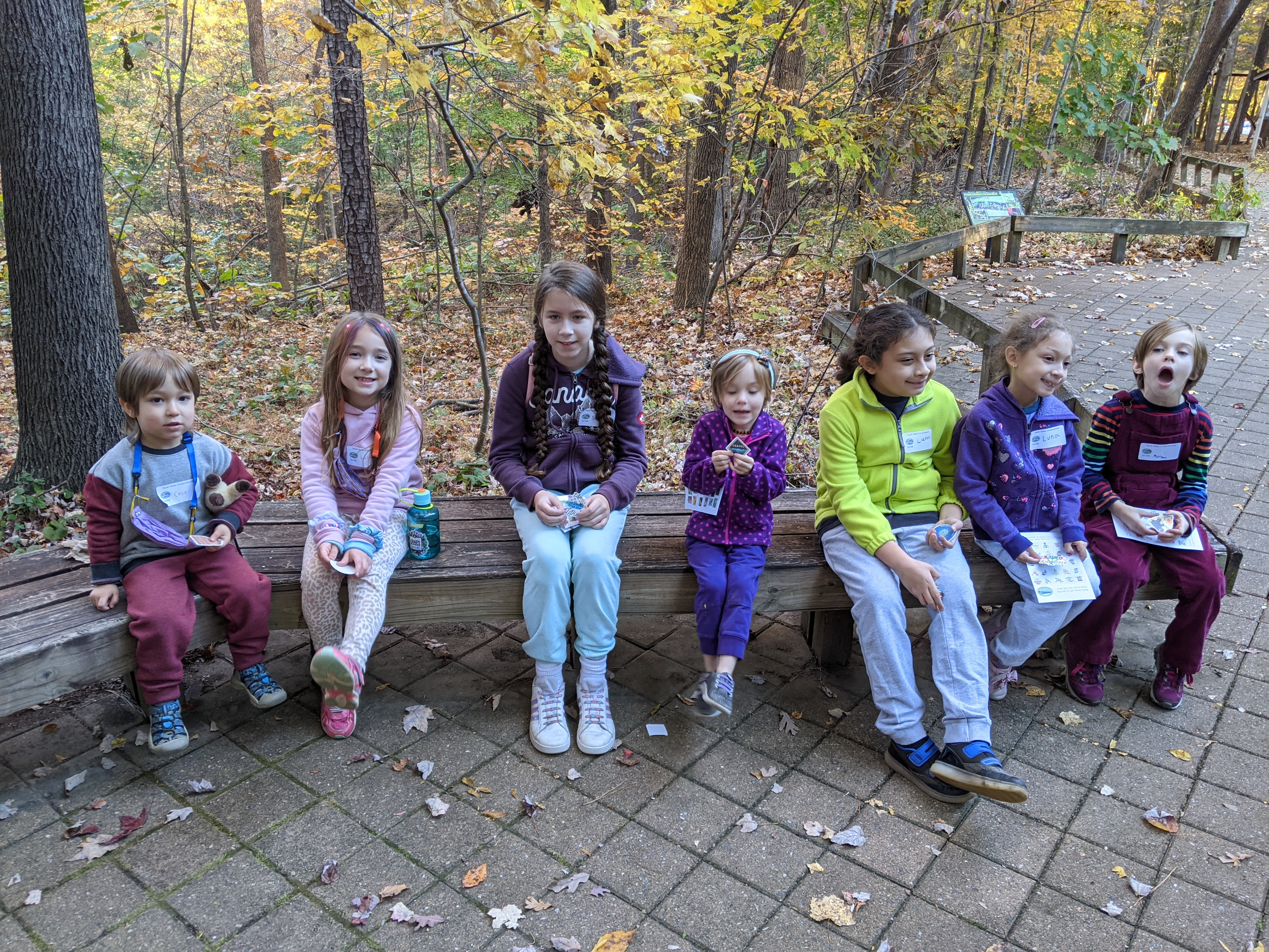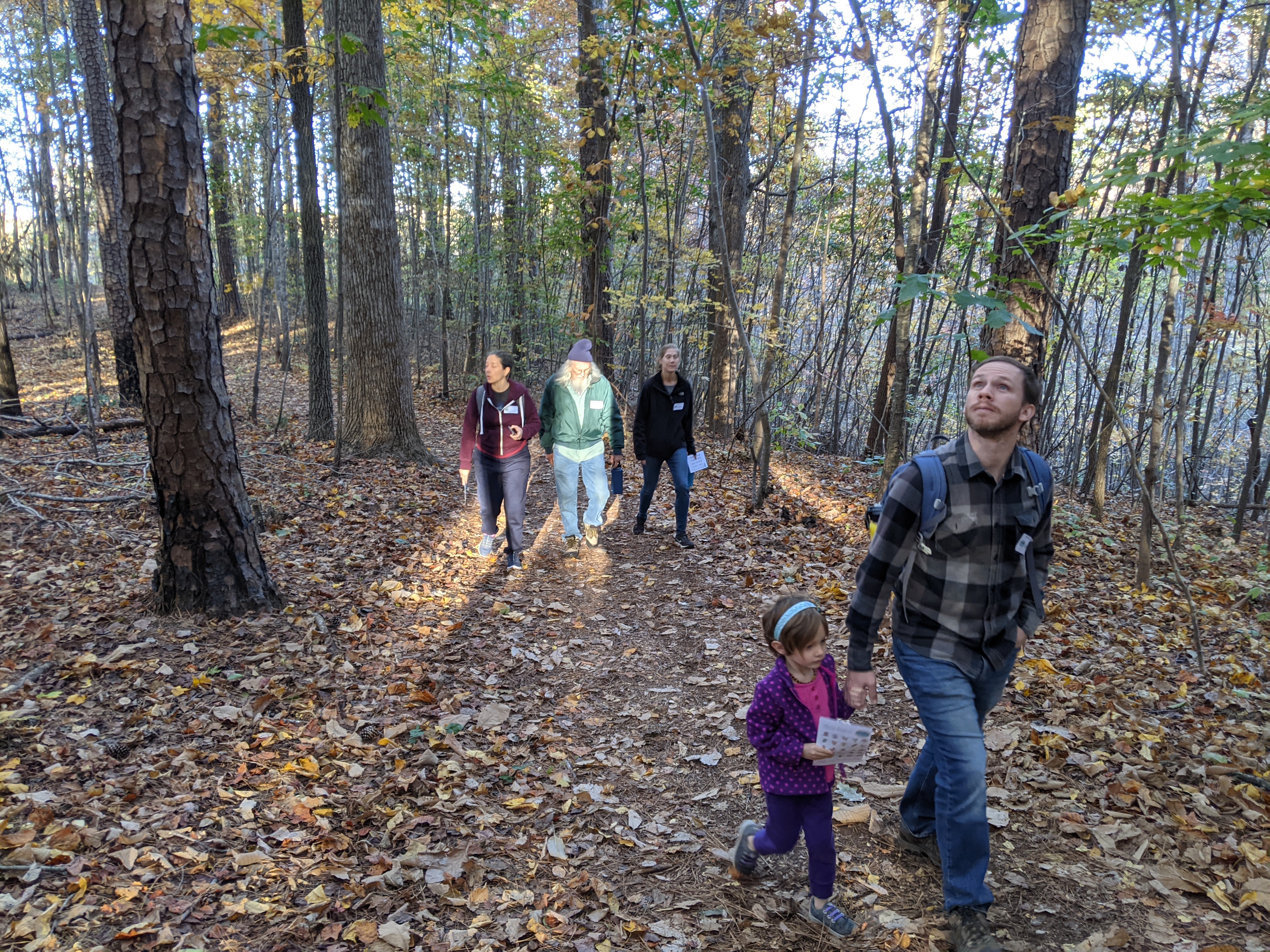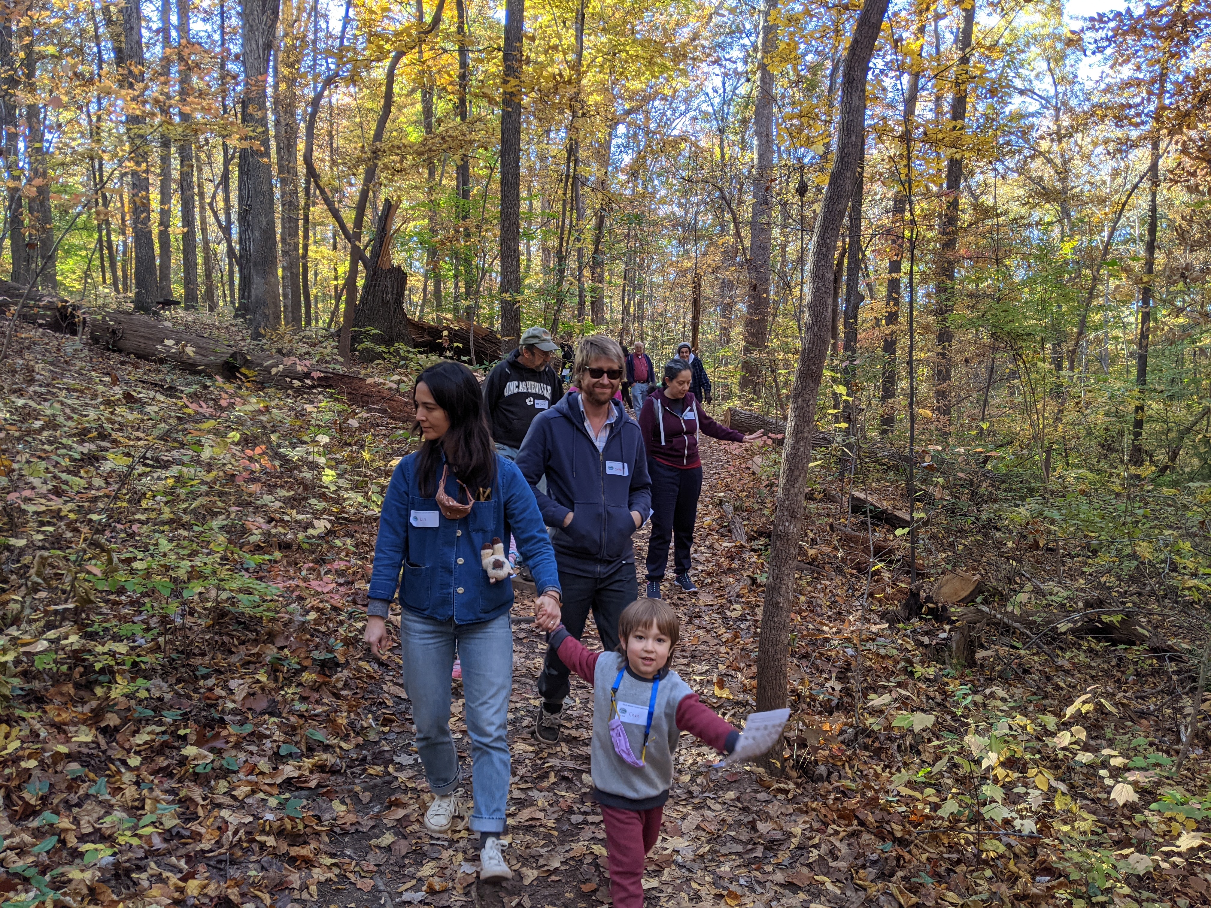 South Wake Conservationists guided a nature discovery hike through beautiful Hemlock Bluffs Nature Preserve today. Looking up, down, and all around on the leaf-covered trails, these kids found many of the items listed on their discovery cards and more. These included the iconic hemlock tree growing on the north side of the famous bluffs, as well as various creatures under logs, signs of previous forest burns, amazing fungi, wild ginger, and more! Ranging in age from 3 to 10, everyone had fun in nature on this absolutely beautiful fall day.