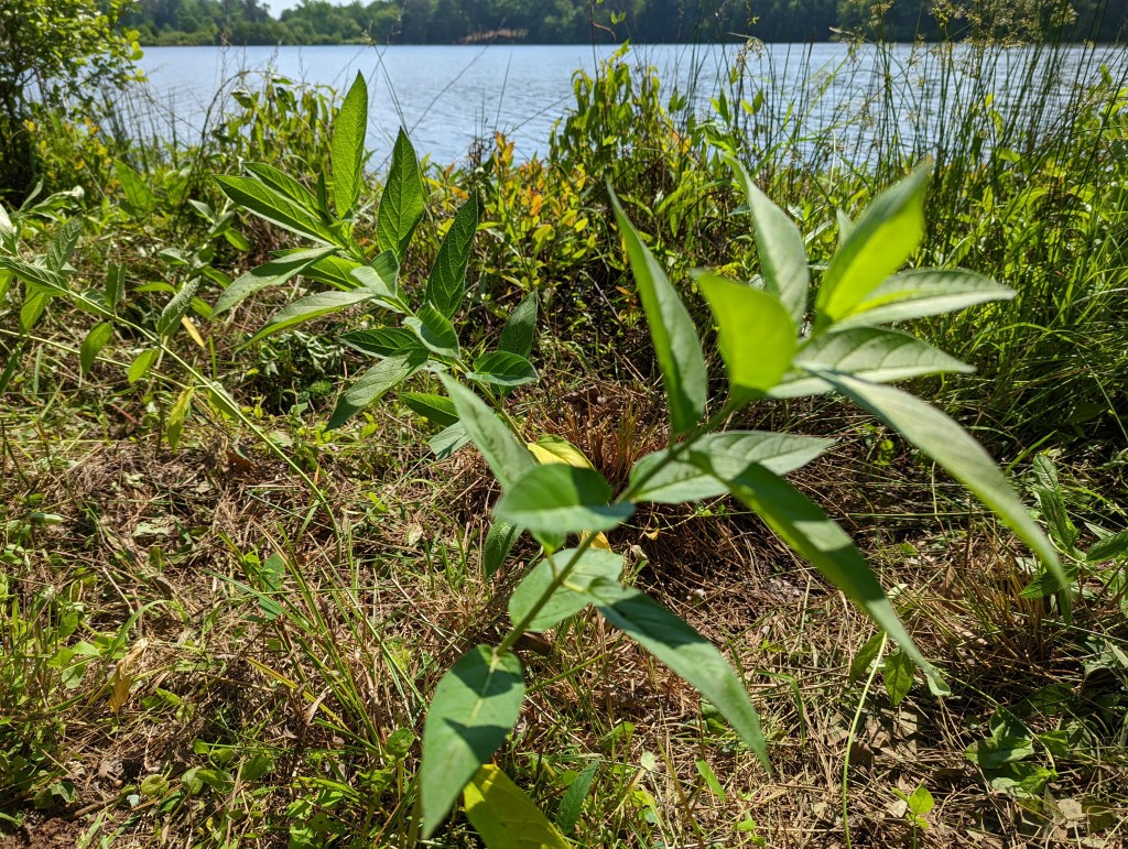 We finally got our tray of 28 swamp milkweed plants where they belong – in the sun with wet clay at their feet. These three-foot plants came from the NCWF Clean and Green Program and were planted along the shore of Bass Lake by Monty and Bill, assisted by Bass Lake Park’s Melinda London, Program Assistant at the park. These plants should be a great source of food and shelter to support the Monarch’s, as they migrate through the area. While we were at it, we tackled some of the weeds at SWC’s new pollinator garden in the park near the picnic shelter. The pollinator plants are thriving, but so are the weeds. We will schedule another workday to tackle those.