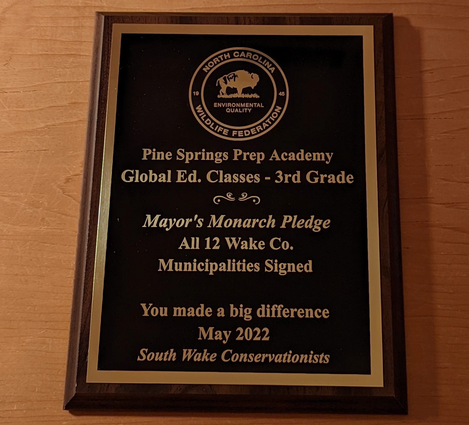 A wonderful celebration was held for 125 third-grade students at Pine Springs Preparatory Academy in Holly Springs Tuesday (May 24). These are the students that wrote letters to mayors in Wake County this spring, which resulted in every municipality in Wake County having committed to the NWF Mayor’s Monarch Pledge. What an amazing achievement, and the kids were very excited to be recognized this week!