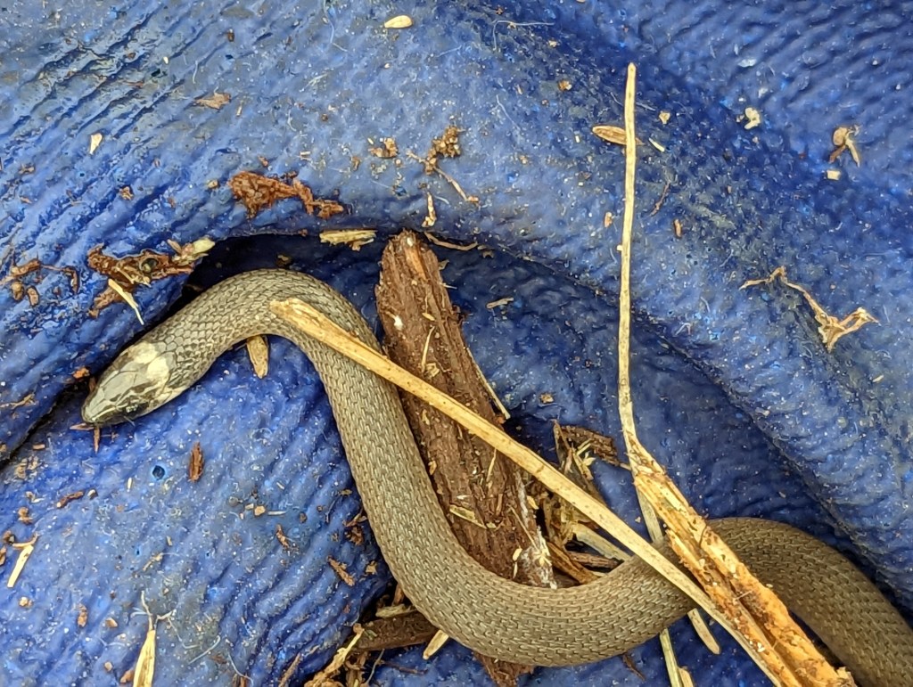 Here is a tiny snake we came across this morning, which is either a ring-necked snake or a rough-earth snake.