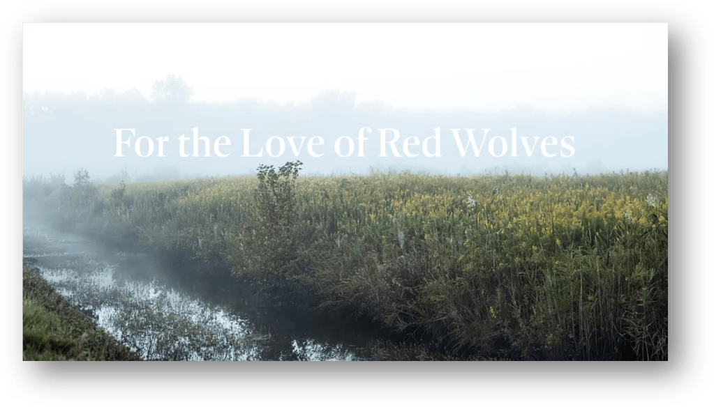 We will be hosting the first in-person public screening of two short documentaries, produced by our own Cassia Rivera, followed by a live panel discussion with the executive producer and directors. The first one is the documentary short “Right of Passage,” which tells the story of the survival challenges that fewer than 30 red wolves currently living in the wilds of eastern NC face. In addition, we will screen the premier of the just-released documentary for kids, “For the Love of Red Wolves,” which will be shown in schools all across North Carolina.