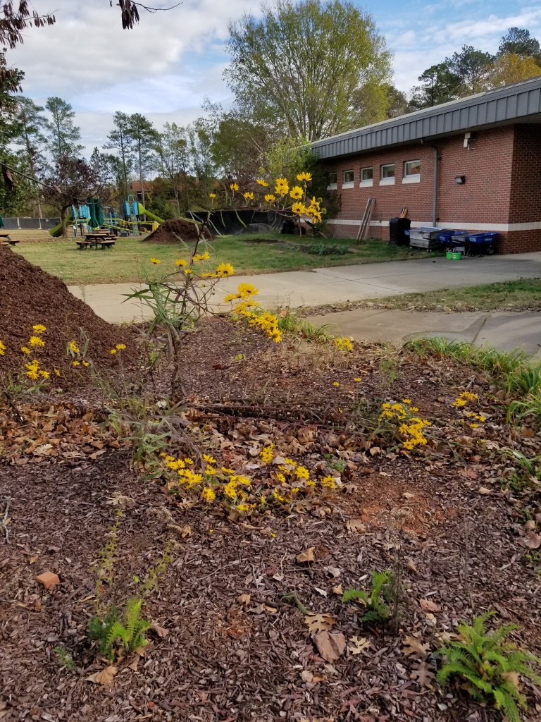 On November 16, 2022 four hardy conservationists braved the chilly weather and had a very productive “work day” at Millbrook Magnet School in Raleigh! Thanks to Bob, Monty, Luke and your truly for all of the weeding and invasive plant removal! We also planted a couple of Rattlesnake Master pollinator plants! Below are pictures of plants that the South Wake Conservationists planted on previous occasions at Millbrook. They include Turk’s Cap, Blue Aster and Swamp Sunflower!