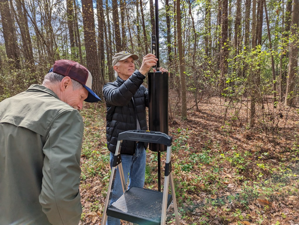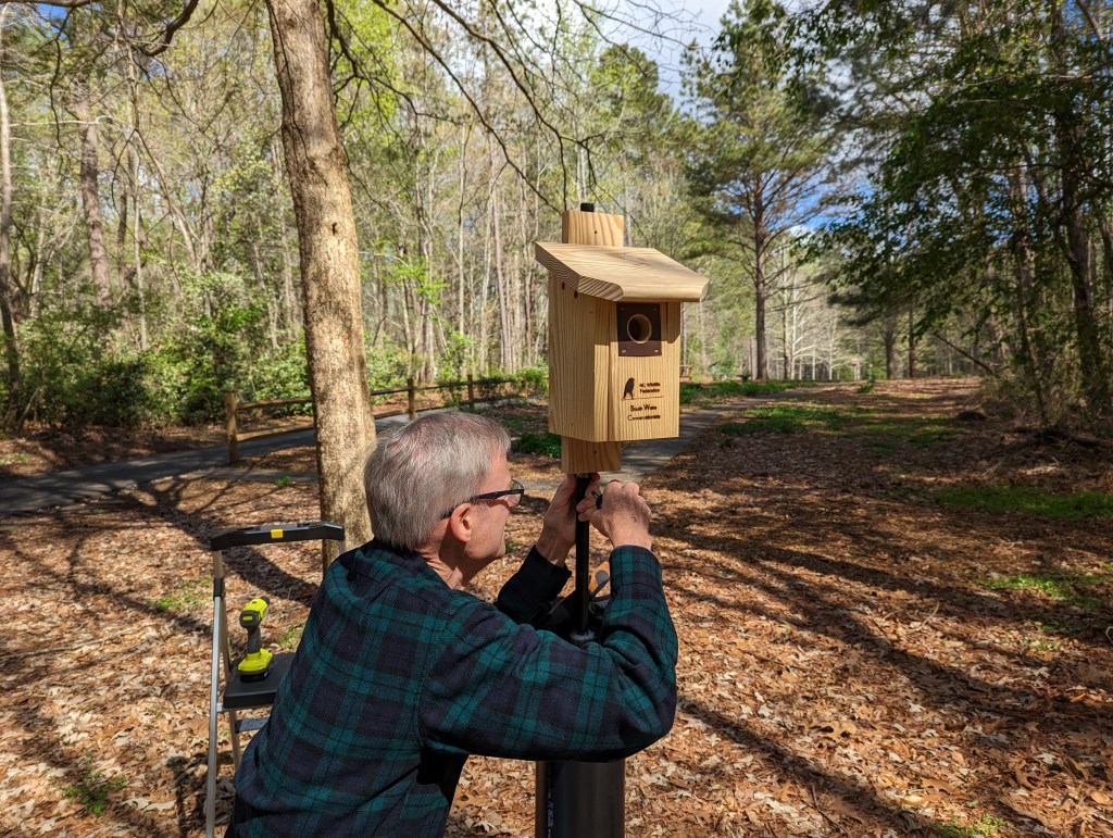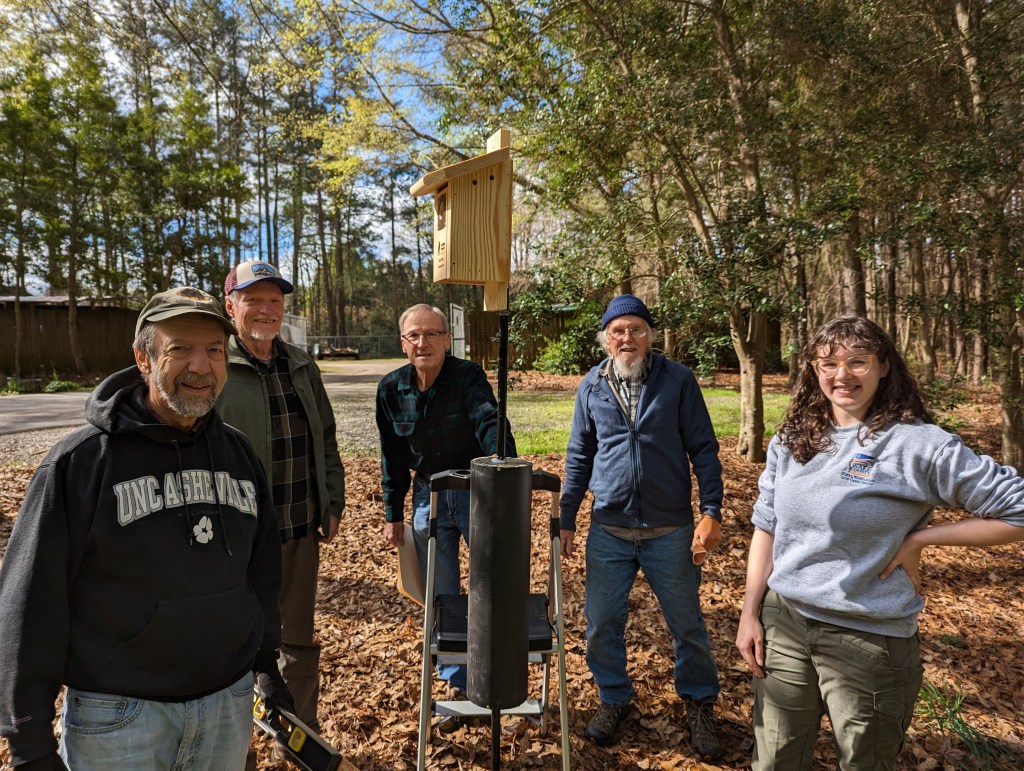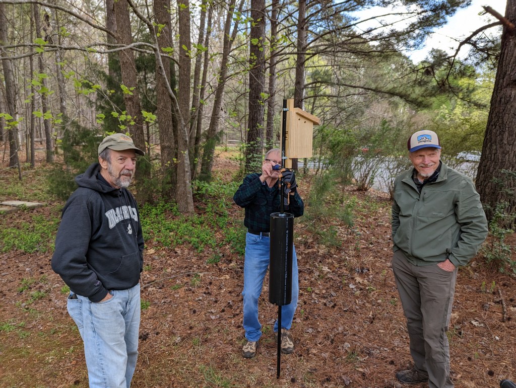 South Wake Conservationists brought our new, custom-branded bluebird houses to Wake County’s Crowder Park in Apex on Wed., Mar. 29. The team worked with Sarah Goldsmith, Park Technician of Education at the park, to identify and replace eleven old houses that had deteriorated and were no longer usable. Jeff Allen has led the way for SWC with a unique pole and critter guard design that he developed and carefully hand-crafted at his home. He also hand-branded each of the new bluebird boxes. Today’s team of Jeff, John and Beth Kinsella, Chad Chandler, Bill Willis, and Monty Morée removed the old structures and installed the new boxes throughout the park. Several bluebirds were sighted, and they were clearly eyeing their new homes. As a bonus, Sarah found a recently-hatched owl egg, which was amazingly large!