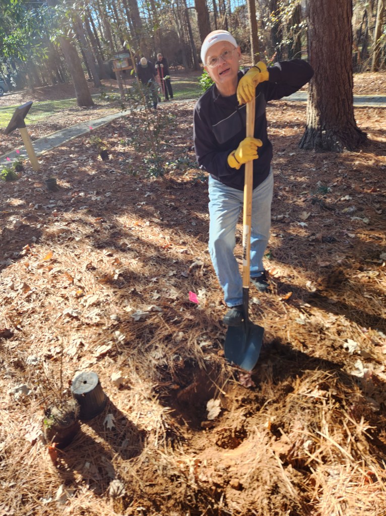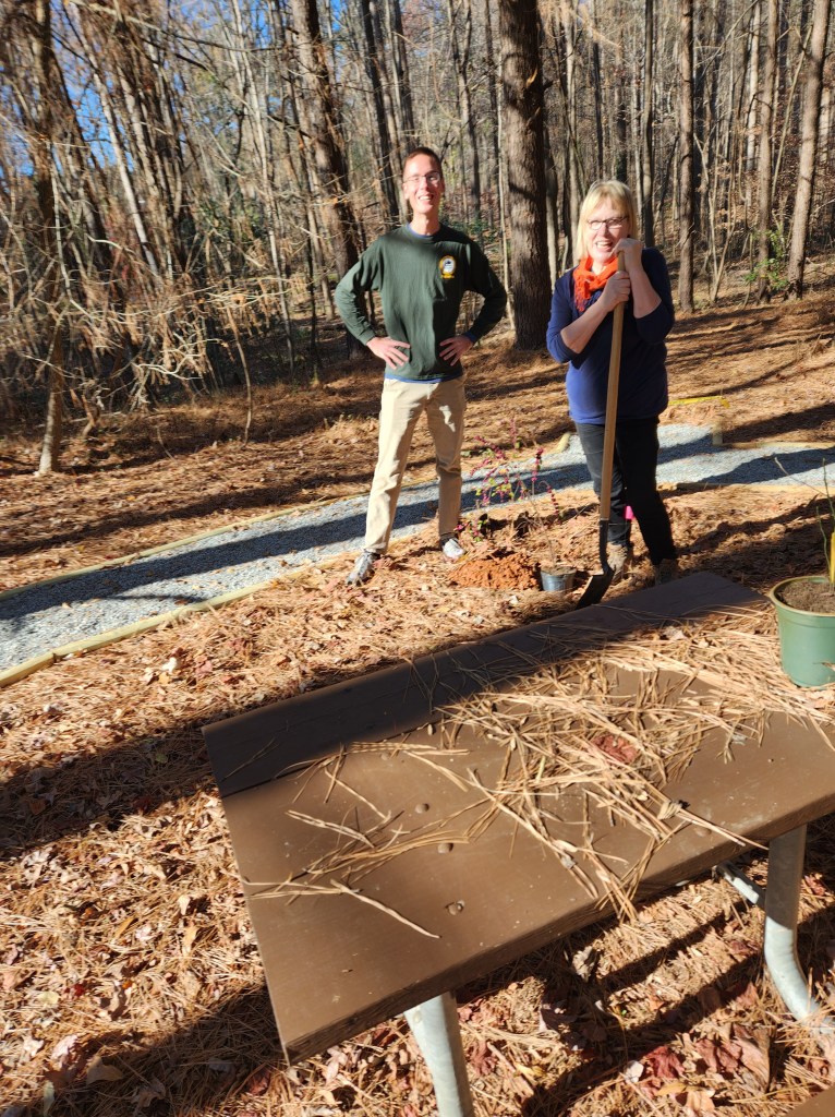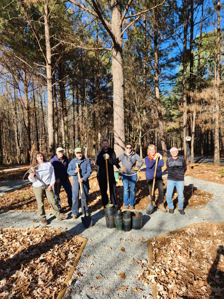 On December 7, 2023 the South Wake Conservationists, North Carolina Wildlife Federation (NCWF), North Carolina Pollinator Conservation Alliance (NCPCA) and Crowder County Park officials teamed up to create a new pollinator garden at the park! The group found a home for 49 pollinator plants and shrubs that prefer partial shade locations. The NCPCA was founded in 2017 and has representatives from twenty conservation-minded organizations. Its mission is to support the health and diversity of pollinators in North Carolina through protection, restoration and creation of pollinator habitat! NCWF is one of its founders!