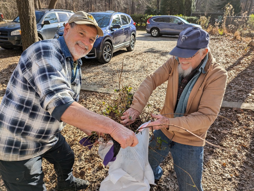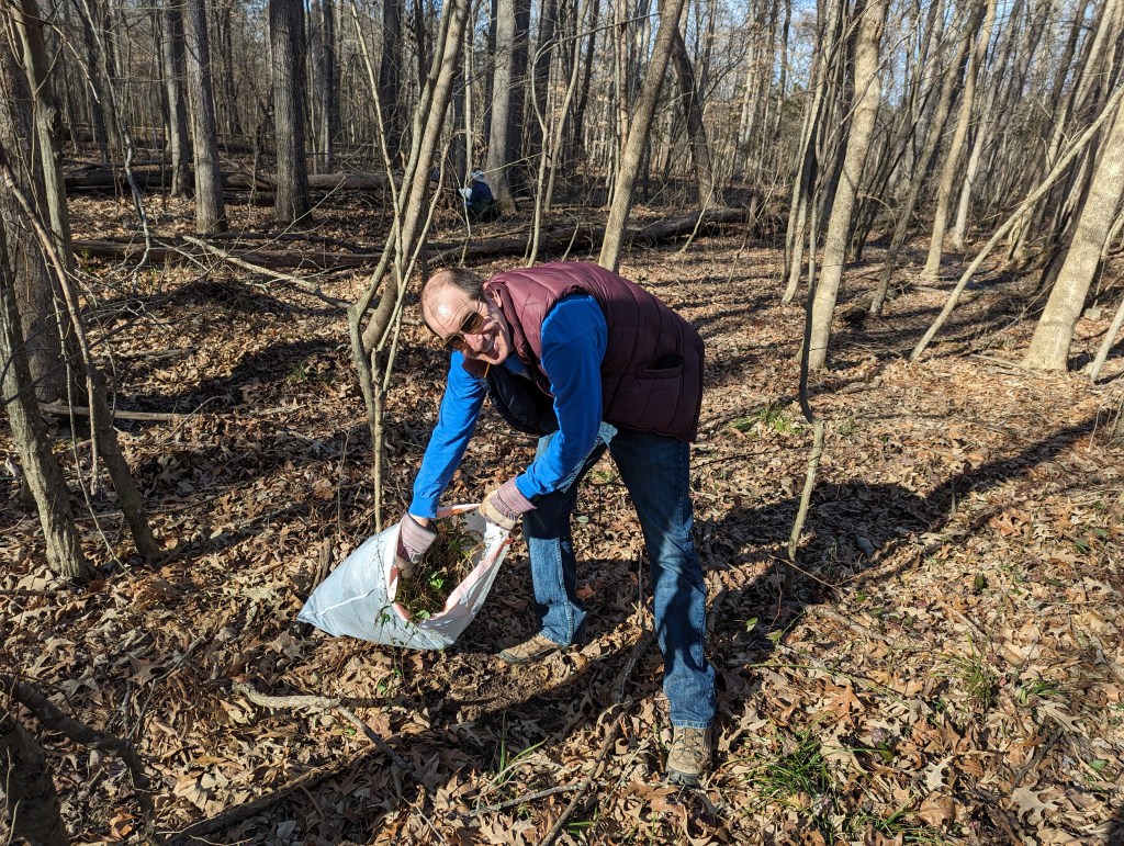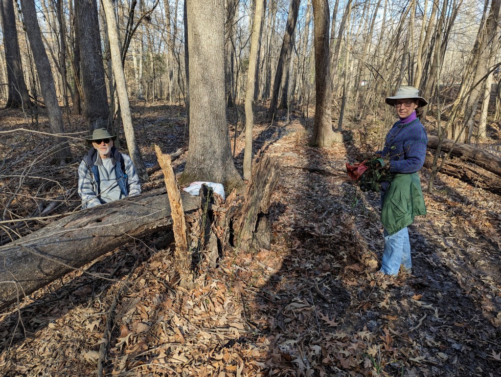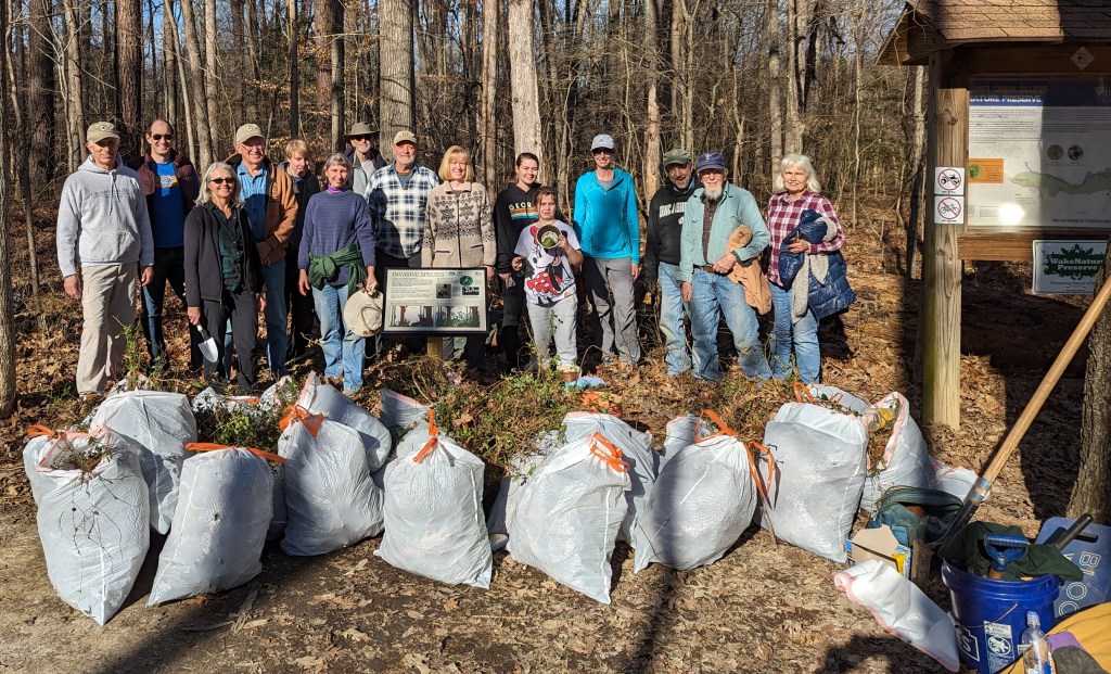 Fifteen hard-working souls joined together on Jan. 30 as a South Wake Conservationists work party to make a big dent in removing invasive plants at the Triangle Land Conservancy’s Swift Creek Bluffs Nature Preserve in Cary. The usual suspects were Japanese Honeysuckle and Chinese Privet, and in the end, twenty-four bags were stuffed full! This will give the soon-to-be-arriving native spring ephemerals room to expand, supporting local wildlife and making a glorious display. Watch for an upcoming hike later this spring to see these ephemerals, when they emerge!
