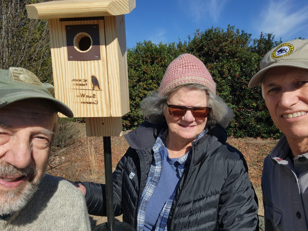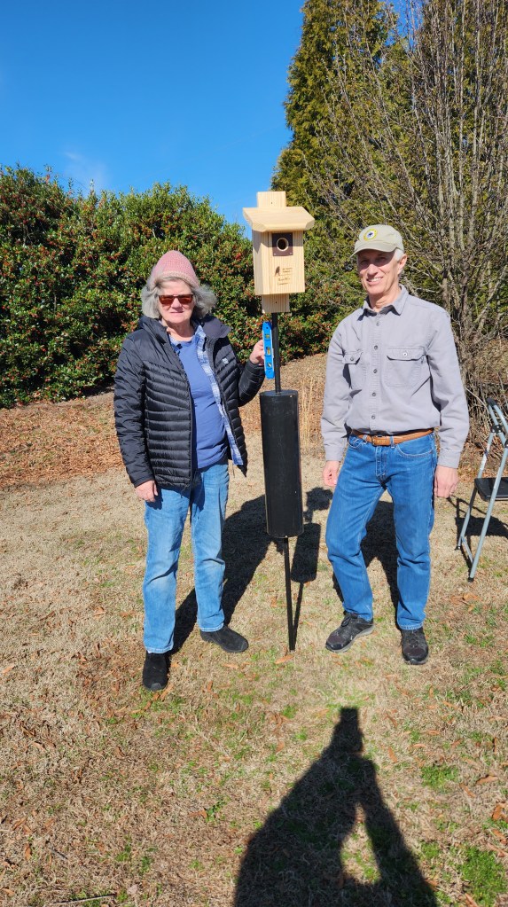 On February 15,2024 the South Wake Conservationists broke new ground by installing four Bluebird houses on “sacred soil!” Even though the birds may not be attending traditional parish events, they will now have the opportunity to raise their chicks on the grounds of St. Bernadette’s Catholic Church in Fuquay-Varina! The installation of the houses comes just in time for the beginning of the nesting season. A fun day for Monty, Beth and her husband!