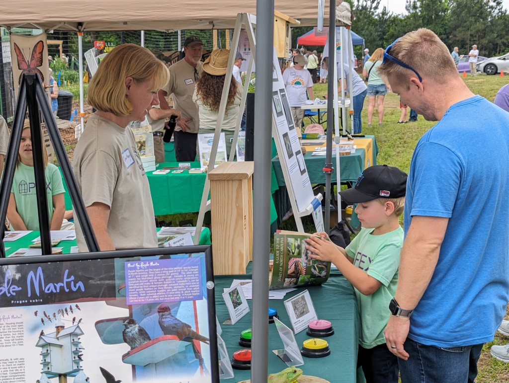 SWC had not one, but two exhibition booths at this event: one for Pollinators and one for Wildlife at the garden! Families and kids of all ages had fun and were very engaged in all the activities at each of these exhibits. John and Bill led tours of the pollinator beds, while Katie and Dave led the activities at the booth, some of which were re-purposed from Kids in Nature Day, like matching pollinators with their preferred plants or playing “Pollinator Jeopardy!” Courtney and Cissy led the activities at the wildlife booth, which included purple martins, bluebirds, frogs/toads, bats, and snakes. Jeff also displayed examples of SWC’s bluebird house assemblies, a bat house, and an owl house.