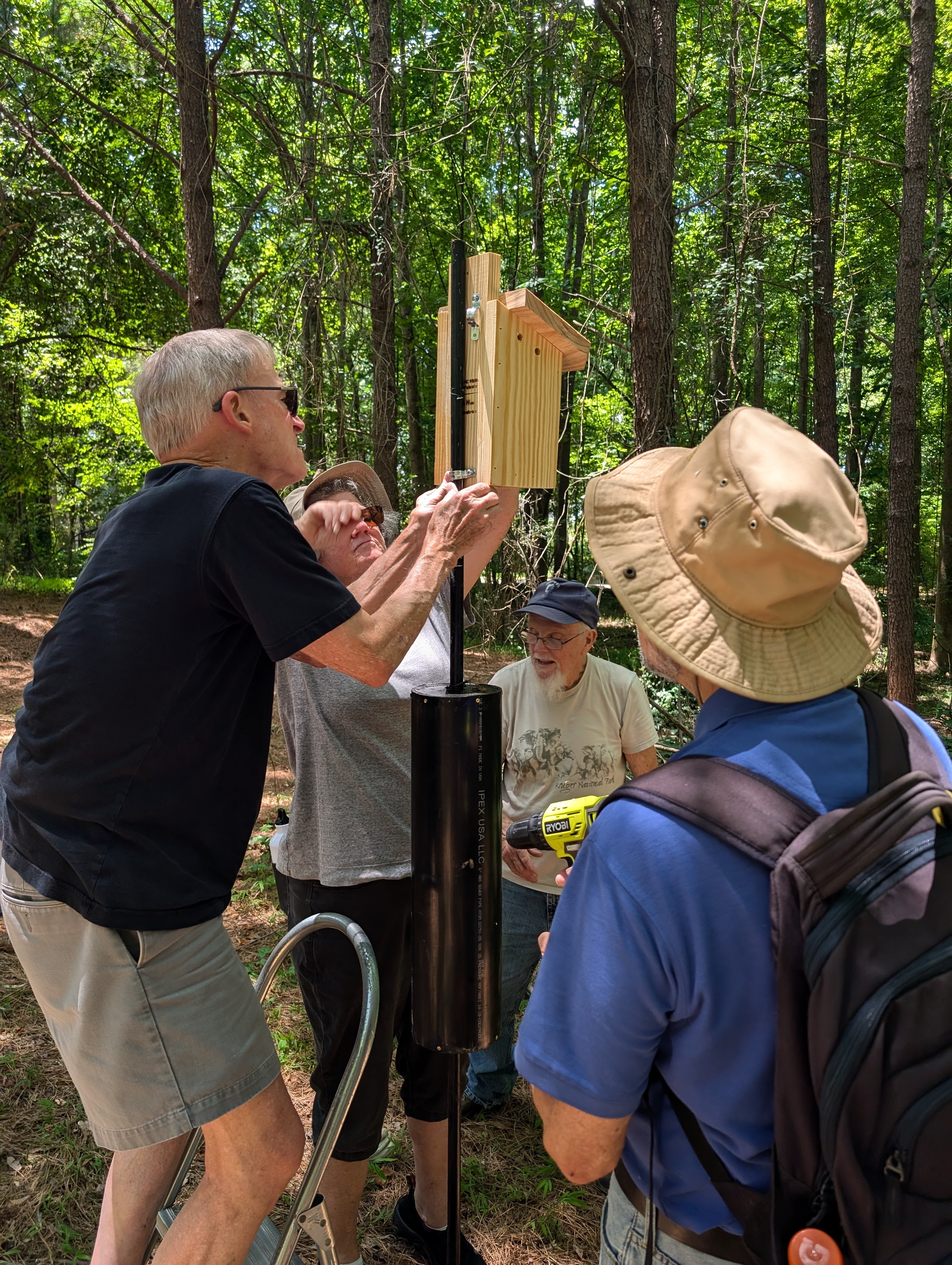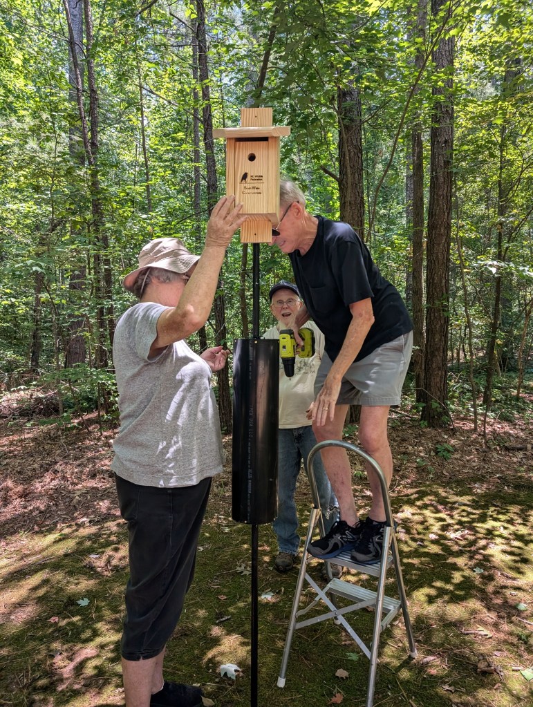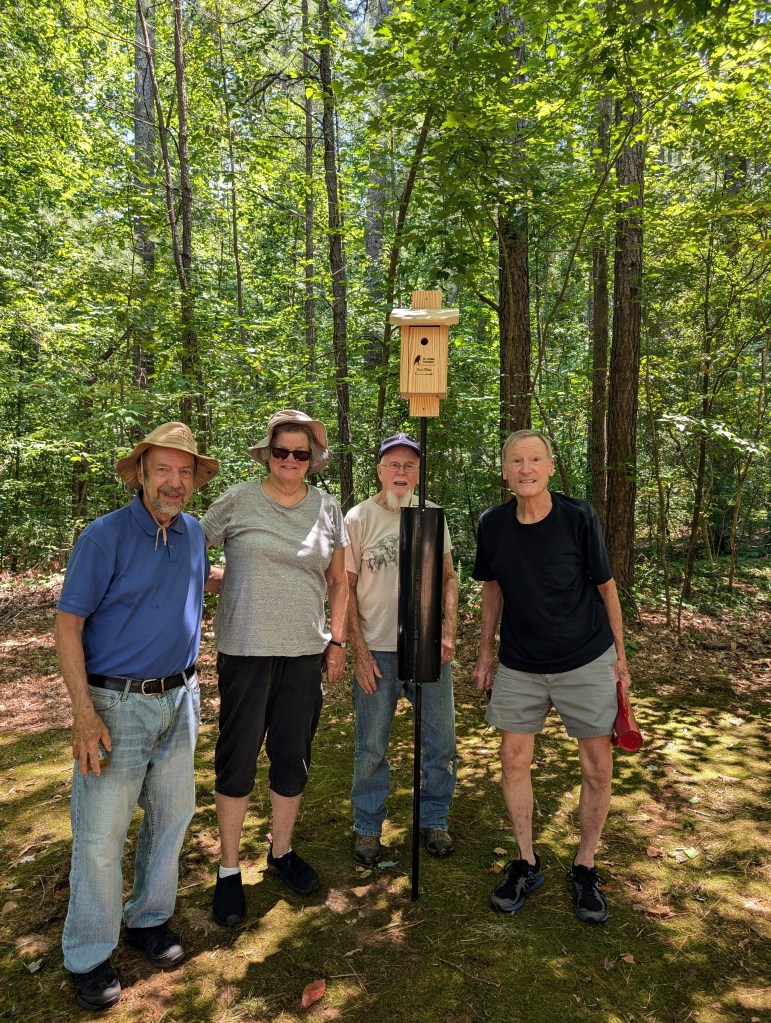 On July 3, 2024 four South Wake Conservationists installed three Brown-headed Nuthatch nesting boxes at Crowder County Park in Apex, NC. The group also included the park’s Sarah Goldsmith. Like many American bird species, the Nuthatch population is decreasing due to loss of habitat and other human activities. Fortunately, there are many conservation-minded groups that are trying to stabilize the population of these amazing birds!