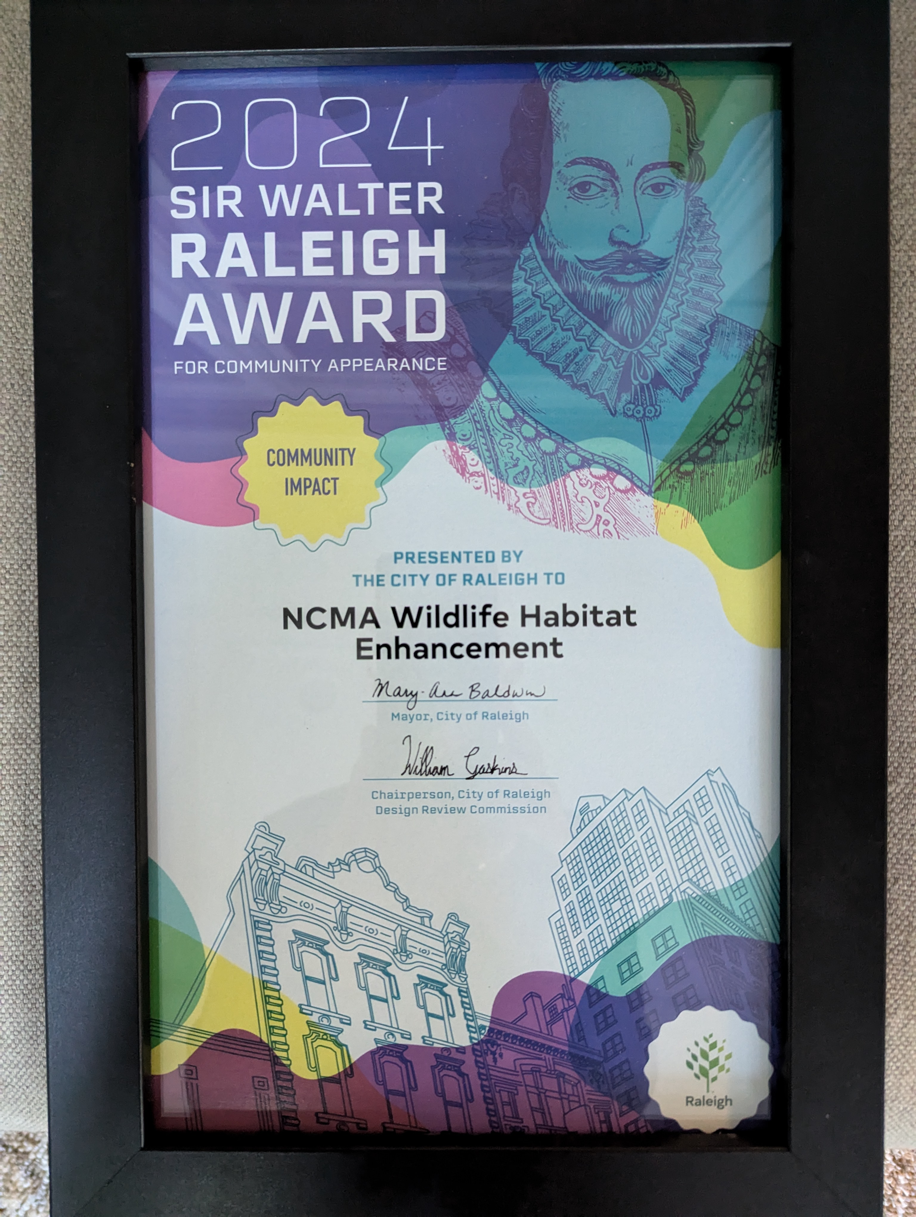 The award was in recognition of many years of work led by SWC’s John Kinsella to enhance the natural environment and wildlife theme at the North Carolina Museum of Art Park in Raleigh. SWC has led numerous workdays to plant native trees, plant pollinator plants, remove invasive plants, and assist with the development of a special nature trail designed for the sight impaired, for which NCWF was a major sponsor. John shared the award receipt with Rachel Woods, Director of Museum Park.
