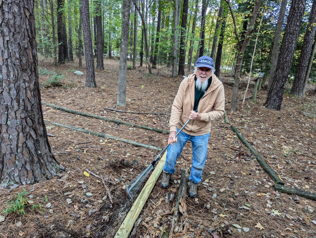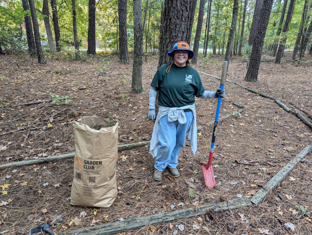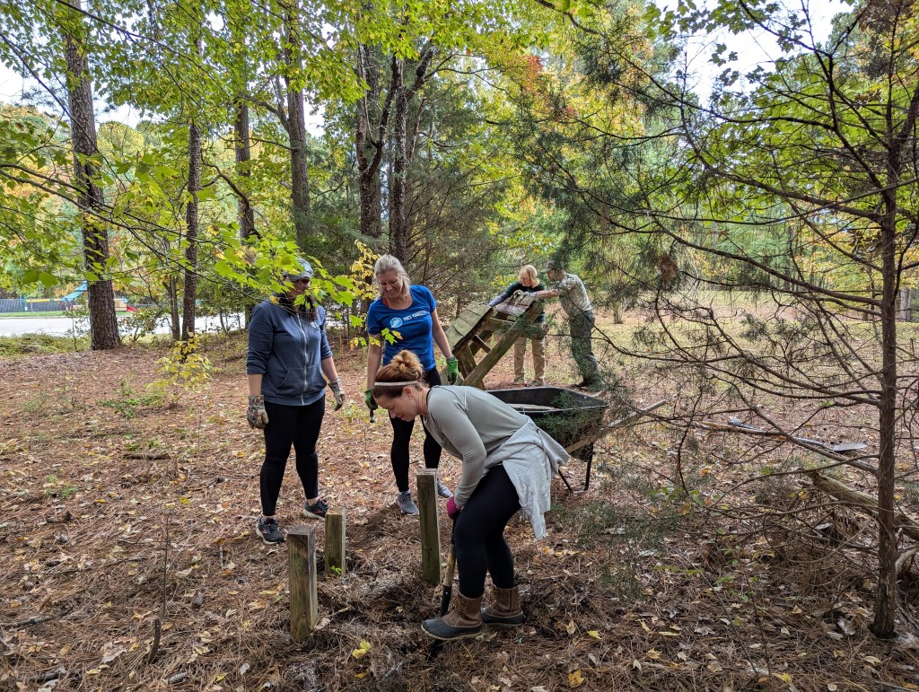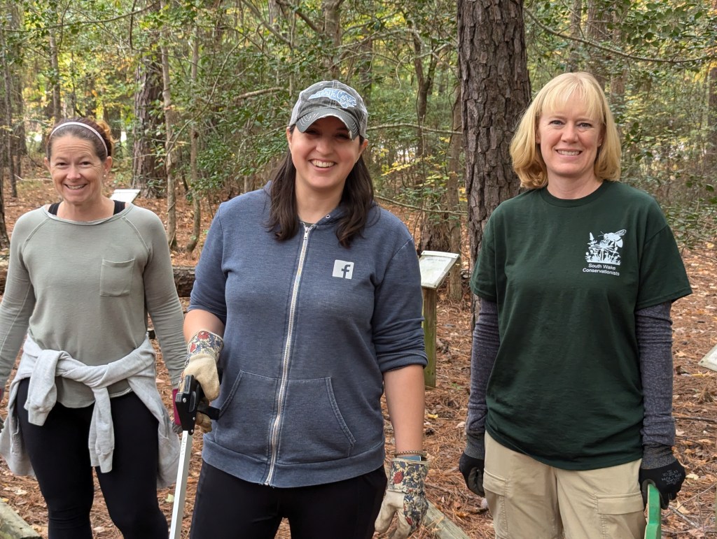 The restoration and reimagination of an old nature trail at West Lake Elementary School in Apex began this afternoon with some preliminary site cleanup tasks. SWC and school PTA volunteers, led by Courtney Rousseau, pulled out and replaced numerous rotted path timbers, removed briars and other overgrowth along the paths, removed deteriorated birdhouses and other structures, picked up litter (including a large tire and rim!), and generally got prepared for the next phase of the project. We found some interesting amphibians and insects under the timbers along the way, including the northern slimy salamander in the photos below.