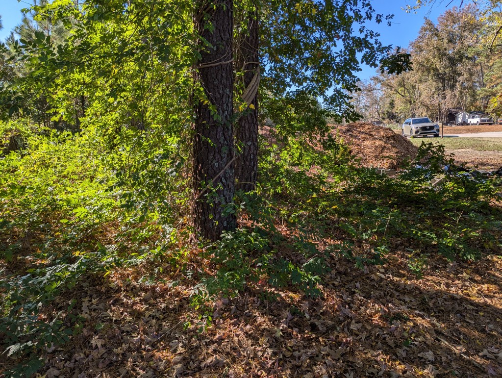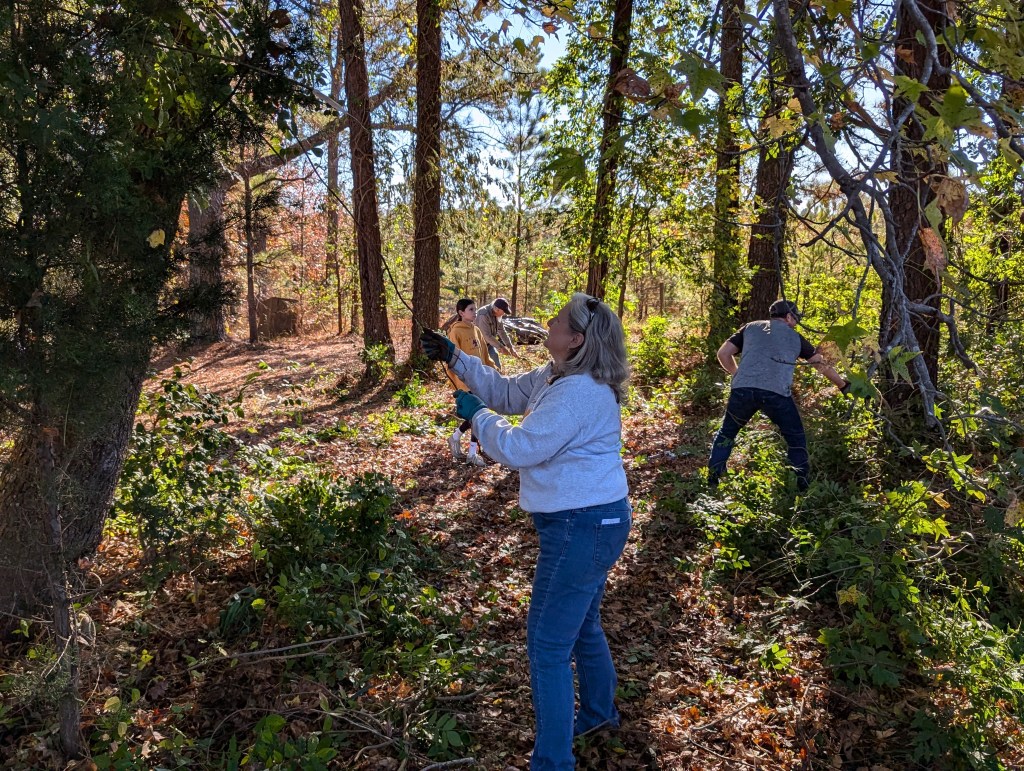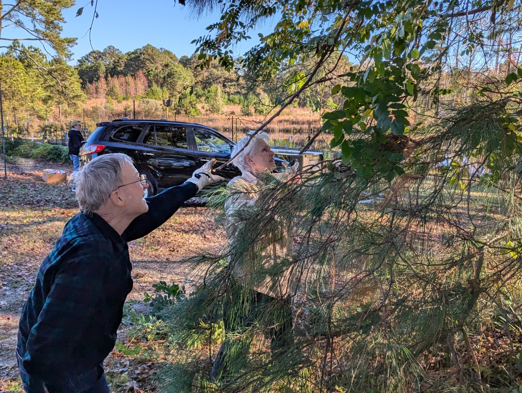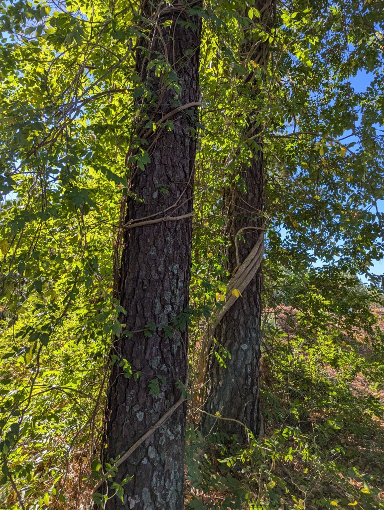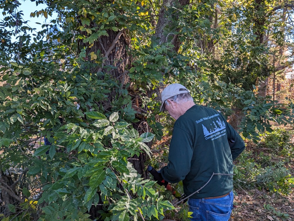 Gardeners at Simple Gifts Community Garden in Apex and South Wake Conservationists joined forces Saturday morning to remove all the wisteria that has been forming a thicket and choking the trees next to the garden. This was a force to reckon with, and the wisteria didn’t stand a chance! Vines as thick as 3 inches were literally strangling these towering trees and even left deep, indelible scars once removed. The result is a grove of mature trees, free of invasives and ready for adding some new, native plants as understory. Many thanks to all who came out today!
