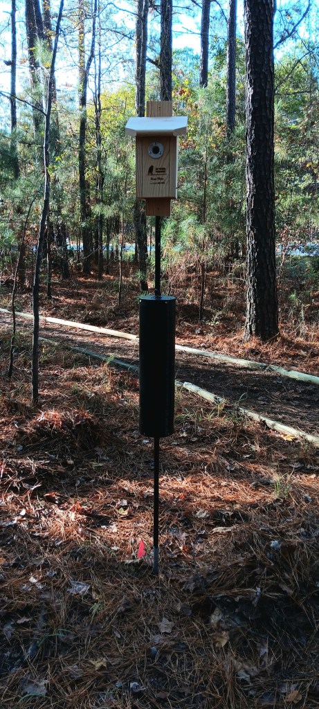 We had a great turnout to continue progress on restoring a nature trail that has fallen into disrepair at West Lake Elementary School on a beautiful fall day today. Courtney Rousseau, project lead, got multiple sub-teams oriented and pointed in the right direction to achieve multiple goals today. The entrance steps to the trail were completely rebuilt and fortified with concrete and mortar to create a safe entrance to the trail. Two new birdhouses were installed, one for bluebirds and one for brown-headed nuthatches. Missing and rotted landscape timbers lining the trail were replaced and several old signposts were removed. Branches were trimmed and a number of native plants were planted today, as well. All in all, a very productive afternoon!