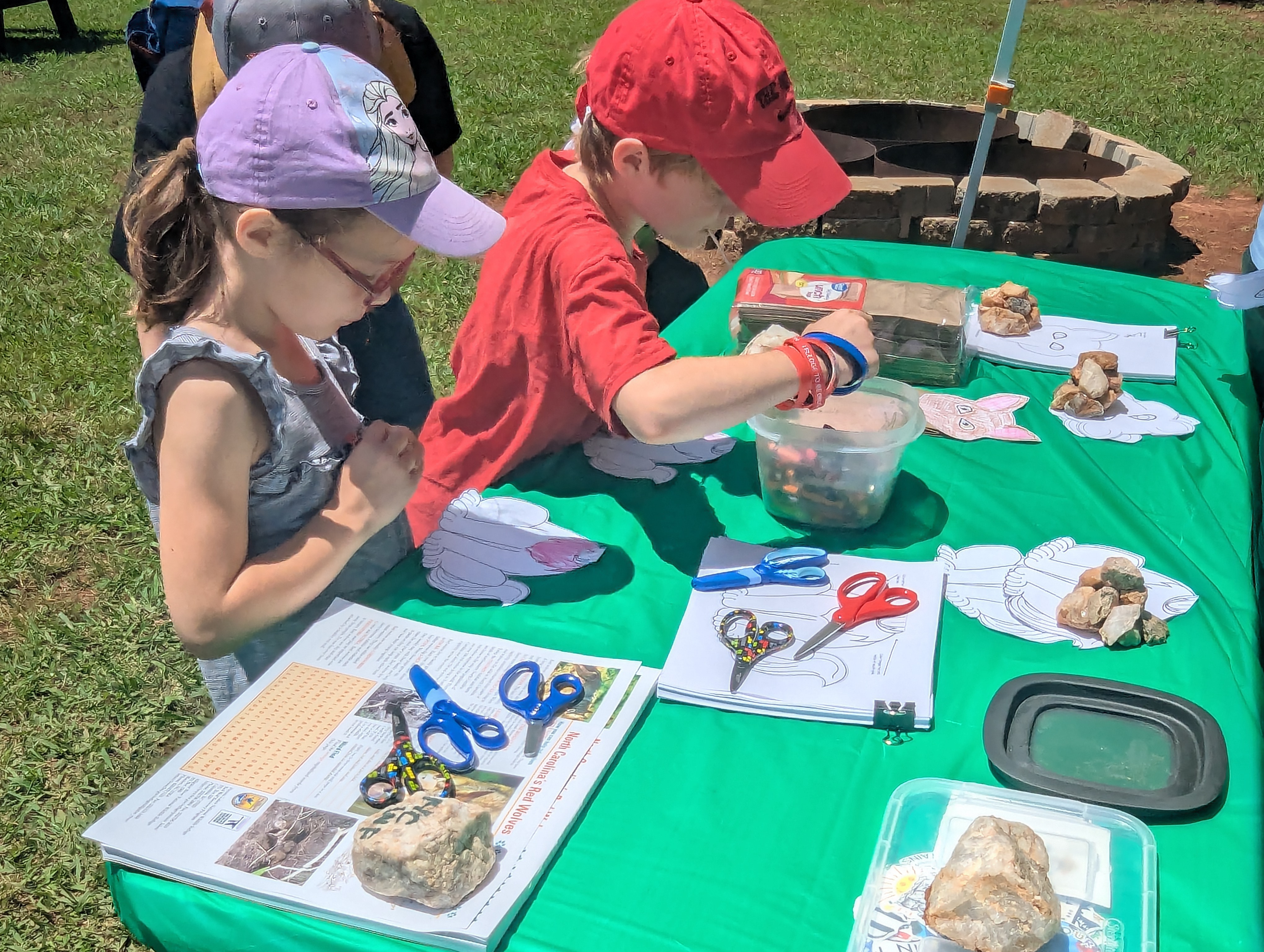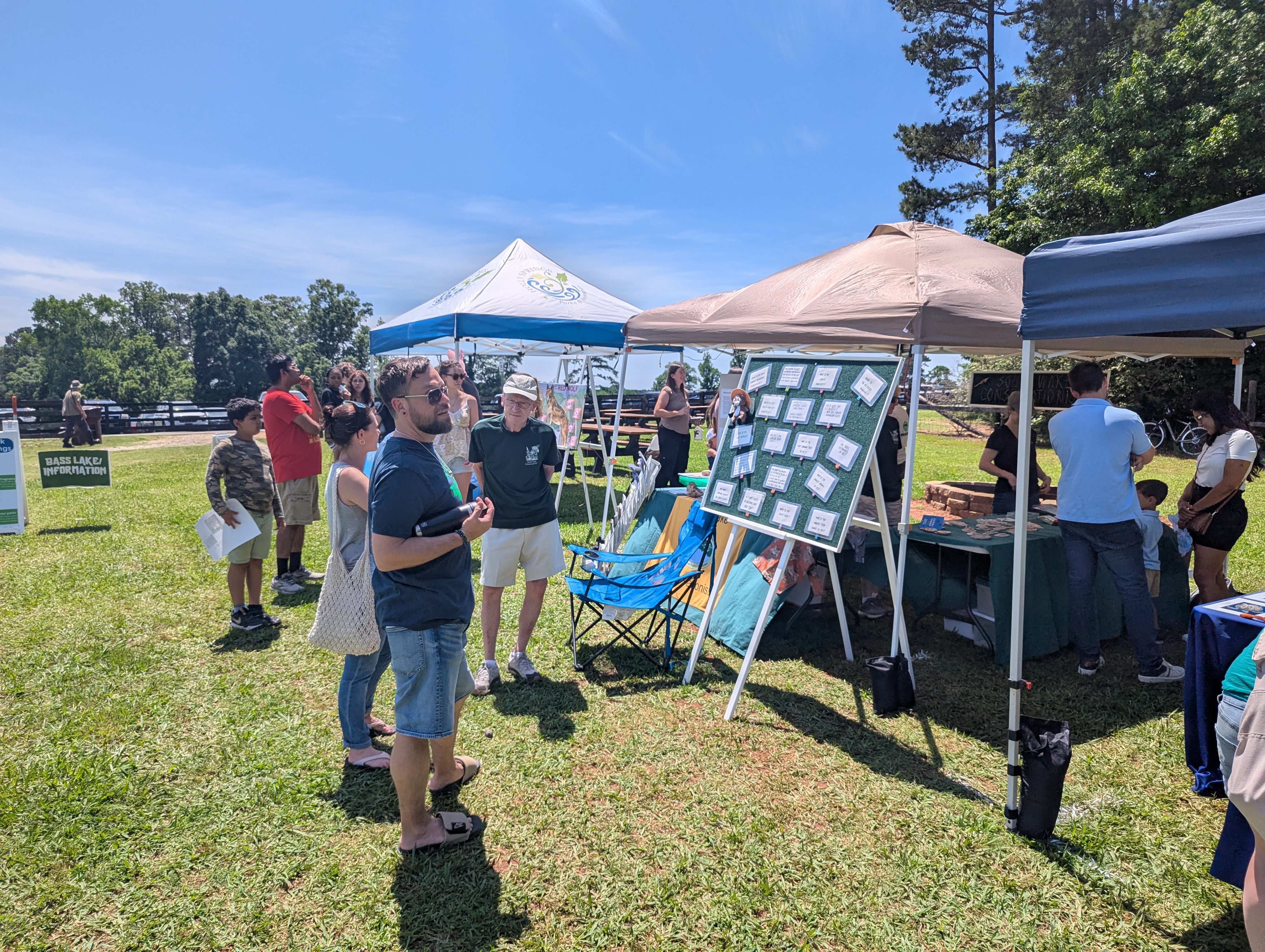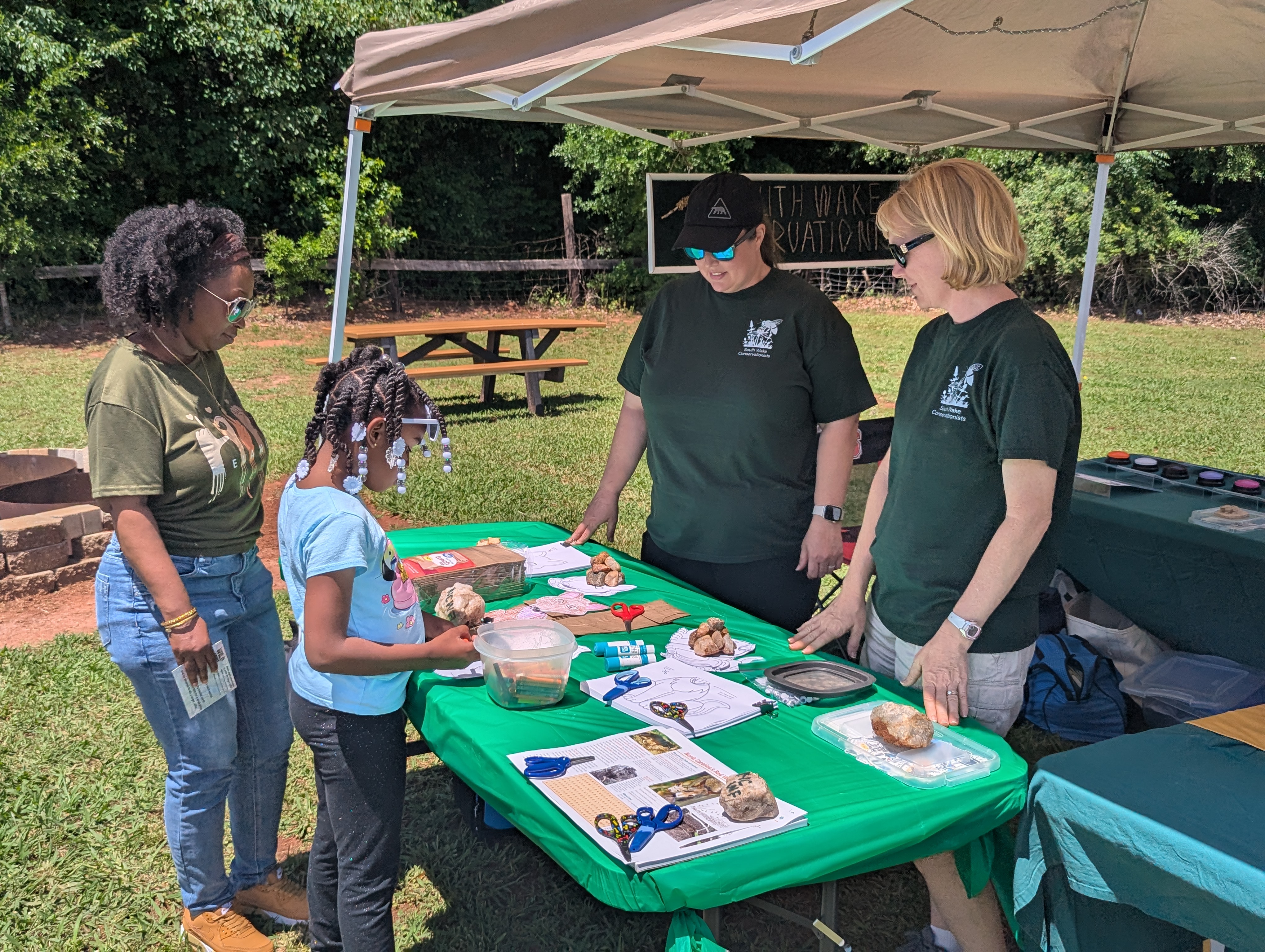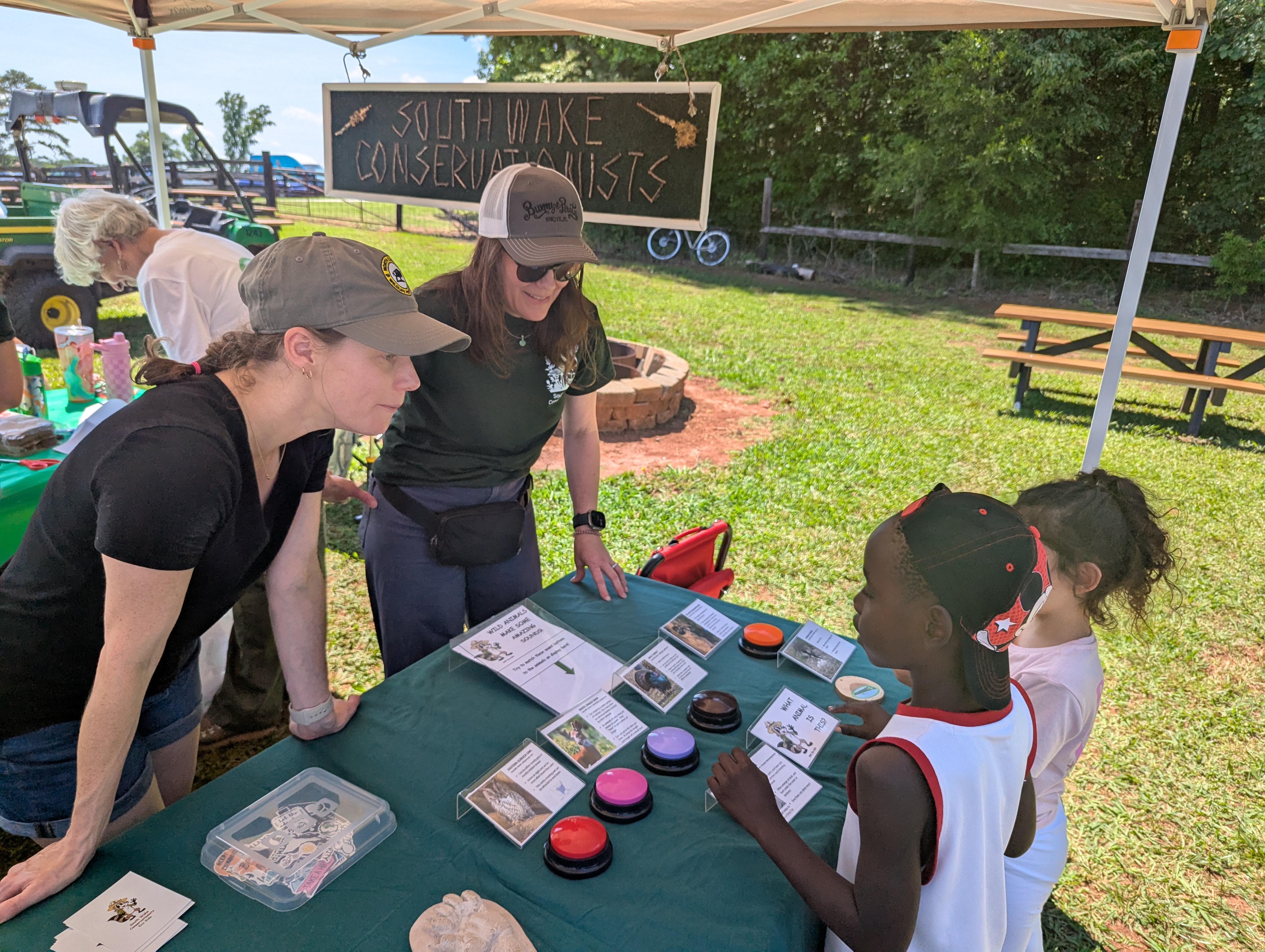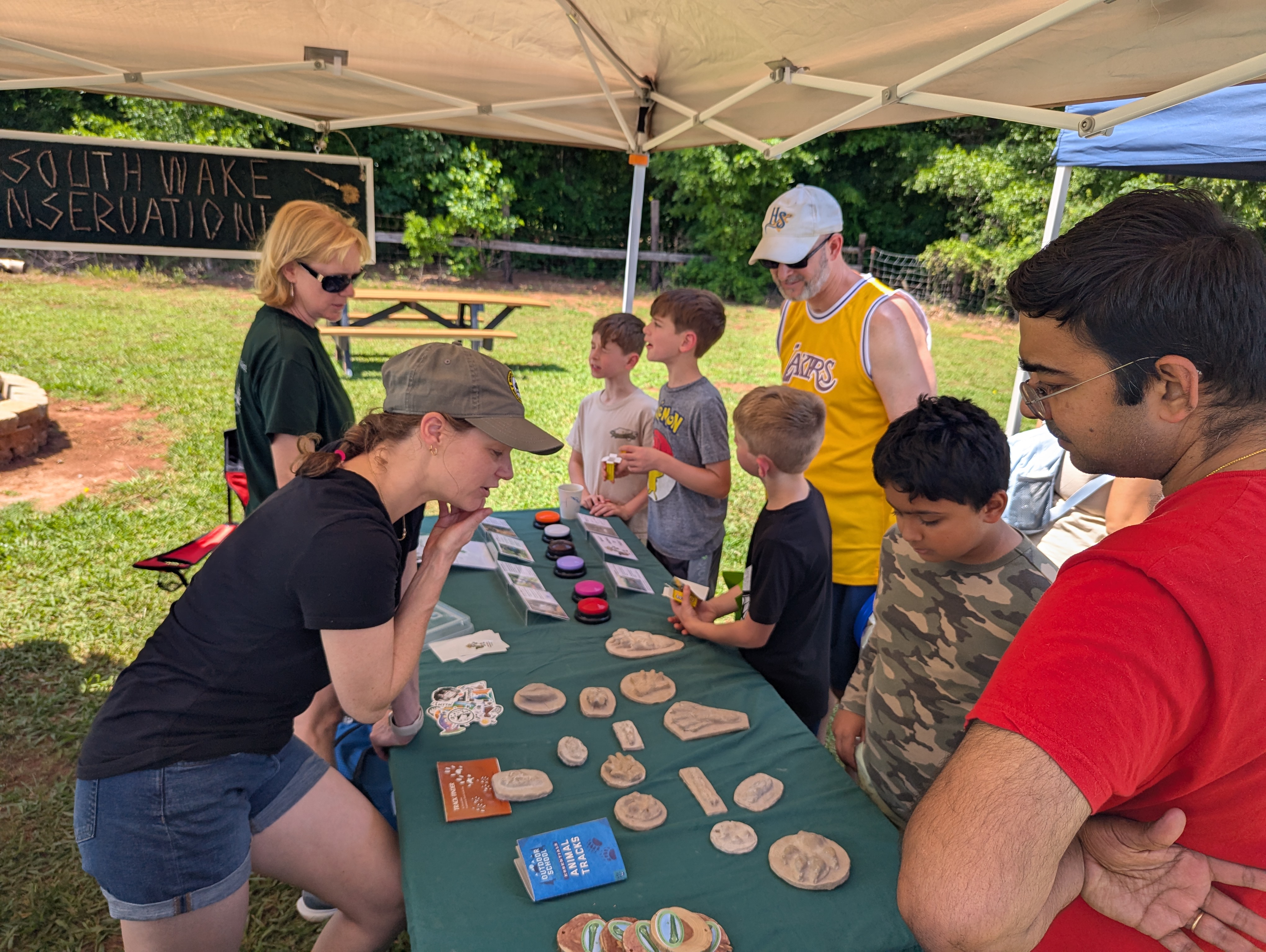 Hanging onto our canopy for dear life! Several canopies at other exhibits went topsy-turvy as the winds gusted during an otherwise pleasant afternoon at the Wild About Nature festival at Holly Springs’ Sugg Farm. We had a great turnout of SWC volunteers, which kept our multi-faceted displays and activities running smoothly, and the kids seemed to have a good time learning about red wolves, animal sounds, and animal tracks. We continued the Save our Sounds campaign message at the main table for adults and got quite a few additional emails off to people’s representatives in the state legislature to stop inshore shrimp trawling.
