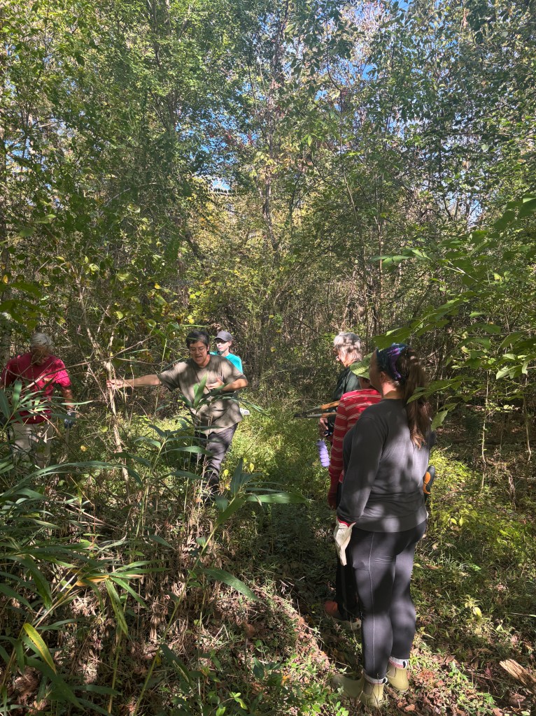 On Oct. 19th, our eager SWC crew was assigned the task of removing woody invasives to give a small patch of river cane more sun to create a beachhead to support additional growth. Due to the thick brush, our small crew was perfect. Celia, the park’s activities director, explained the importance of this native plant to protect creeks. She gave an example pertaining to last year’s Hurricane Helene. Where there were stands of cane, erosion damage to creek banks was minimal, but, where there were no cane stands, the damage was catastrophic.Â