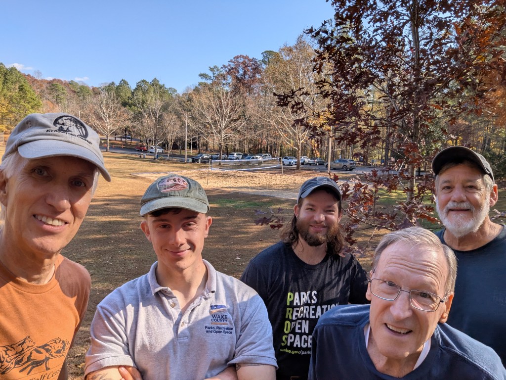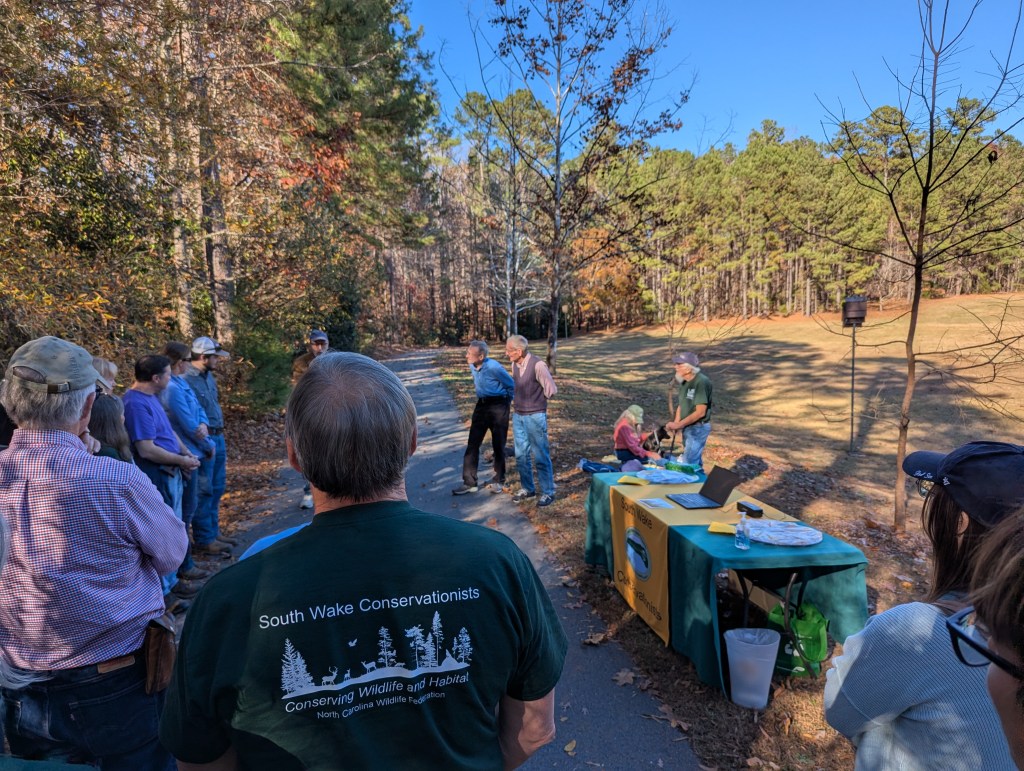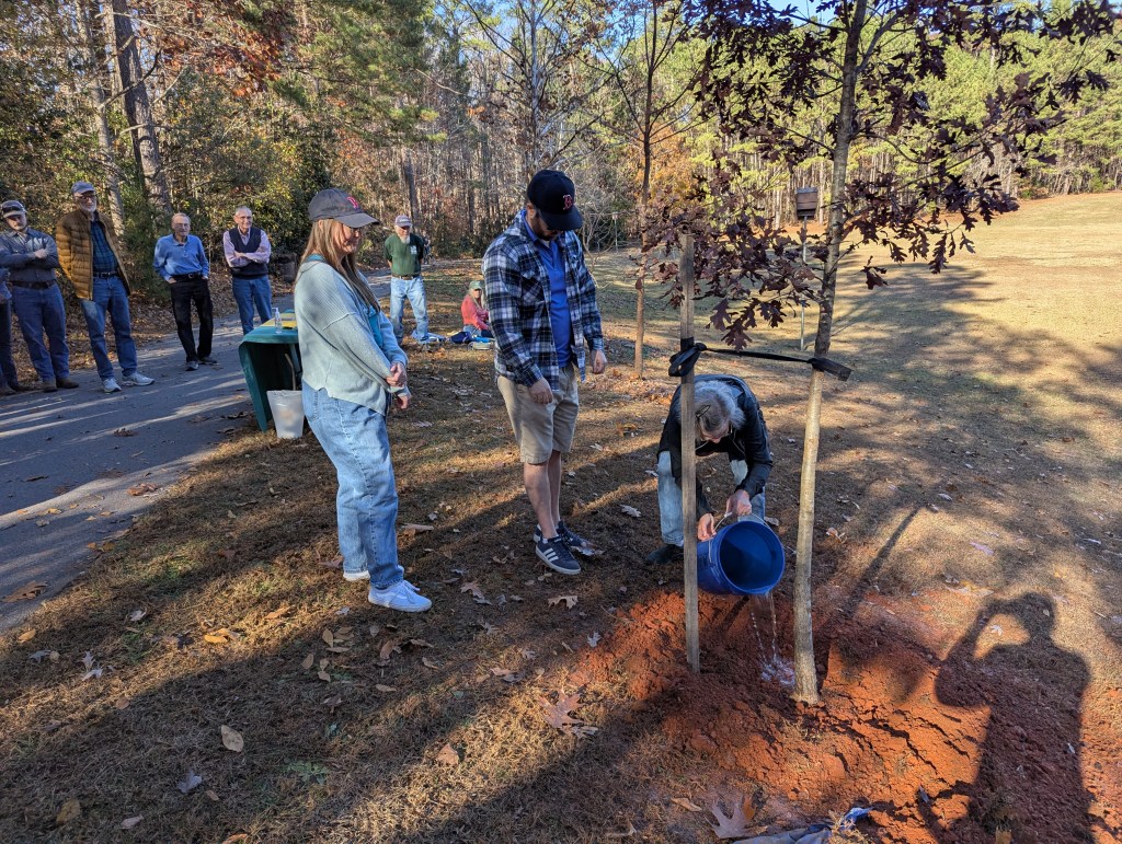 SWC members and friends gathered Sunday afternoon to dedicate a ten-foot white oak (Quercus alba) at Crowder County Park as a living memorial to John Kinsella, long-time SWC VP and board member and key leader of a multitude of conservation projects and activities over the years. Beth Kinsella and John and Beth’s son and daughter-in law Steven and Rebecca christened it with it’s first bucket of water. It was a beautiful day of remembrance. The tree is next to one of the SWC birdhouses John installed at the park, where he has done many different conservation projects, and overlooks a ballfield, which is fitting, given his love of baseball.