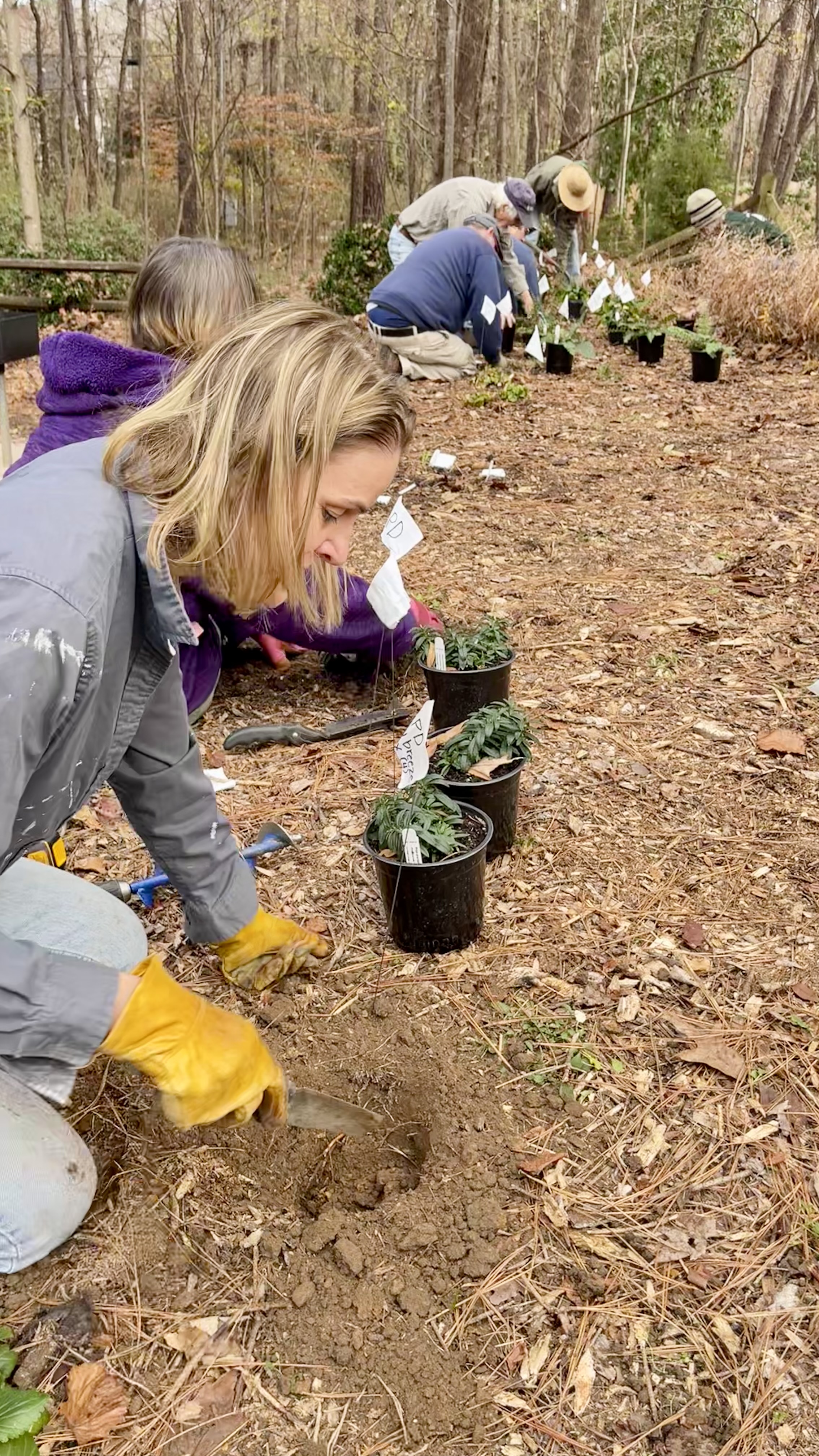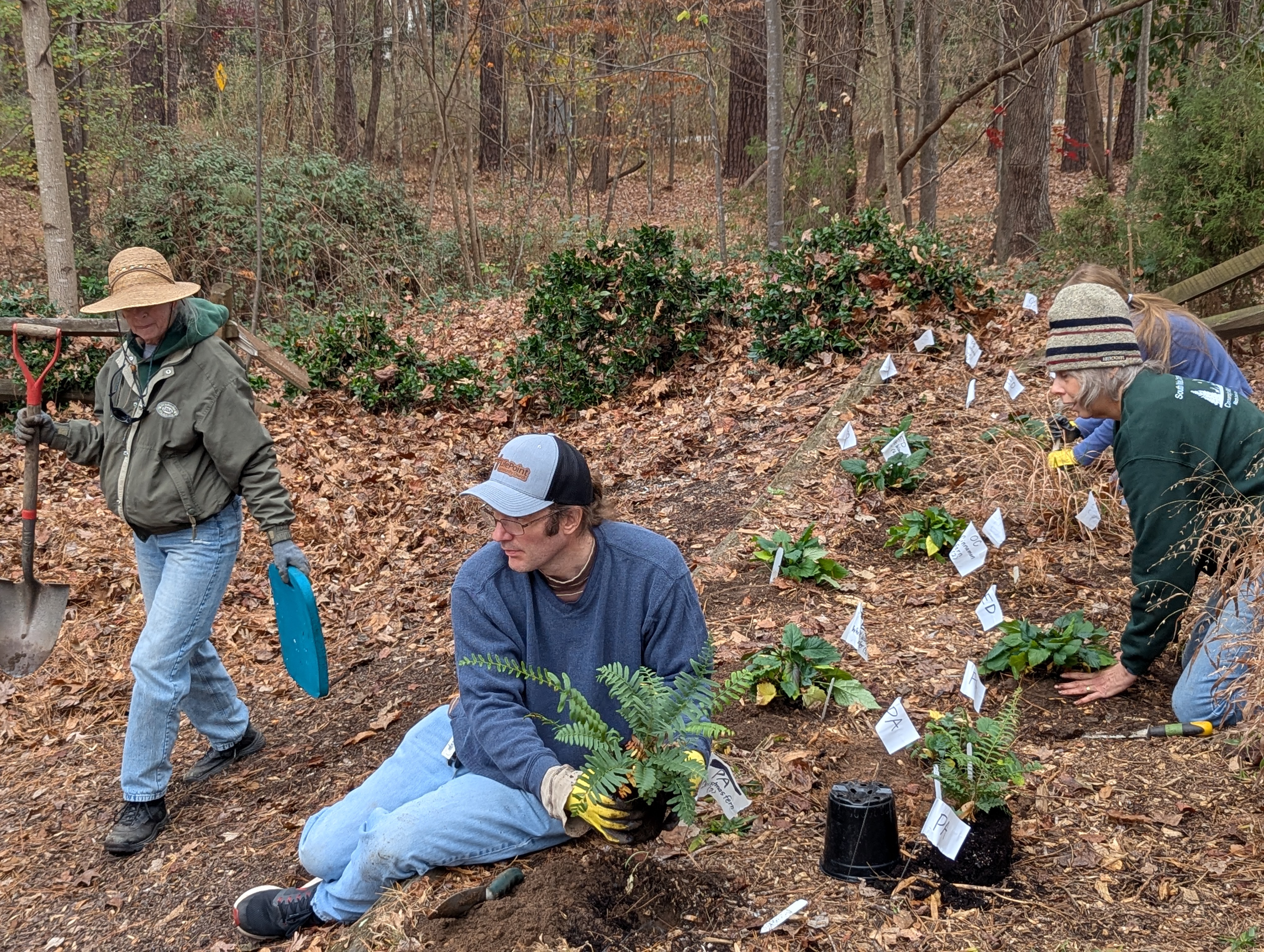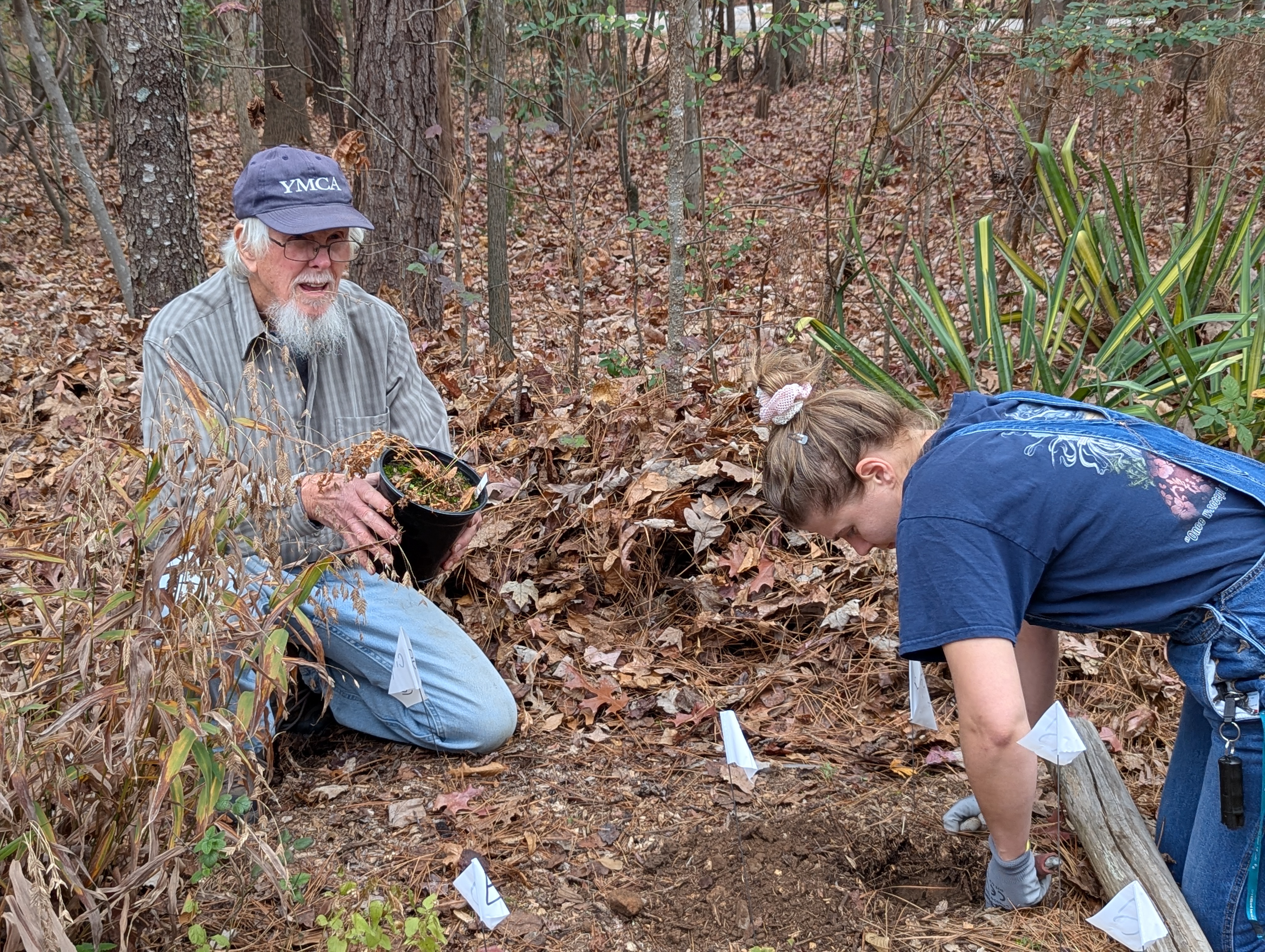 It seems a lot of folks were more than ready to get outside and have some “dirt therapy” after all the Thanksgiving feasting! Over twenty volunteers came to Bass Lake Park Sunday afternoon to refresh, plant, and mulch a multitude of new native plants in the SWC Native Shade Plant Demonstration Garden. Debra Quinlan and Sara Donohoe, co-leaders of the new Wildlife Gardens and Habitat Committee, took this garden to a new level. Sara designed a whole new landscape plan for the site, and Debra organized all the details of what to plant where with flags in advance of people arriving.