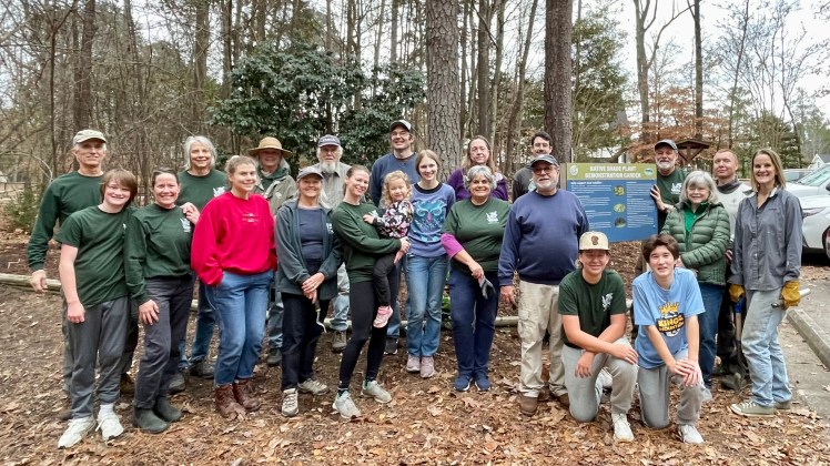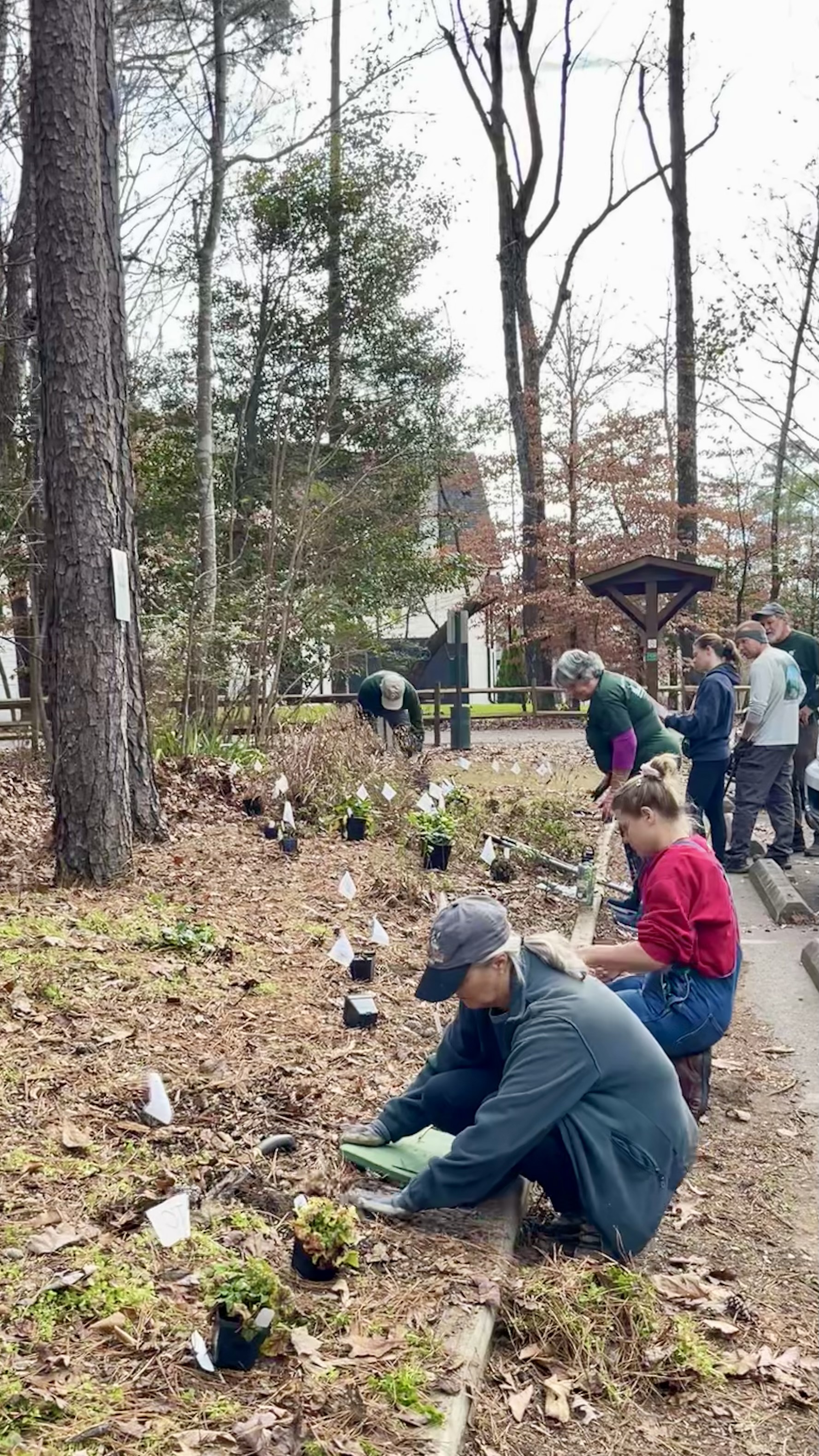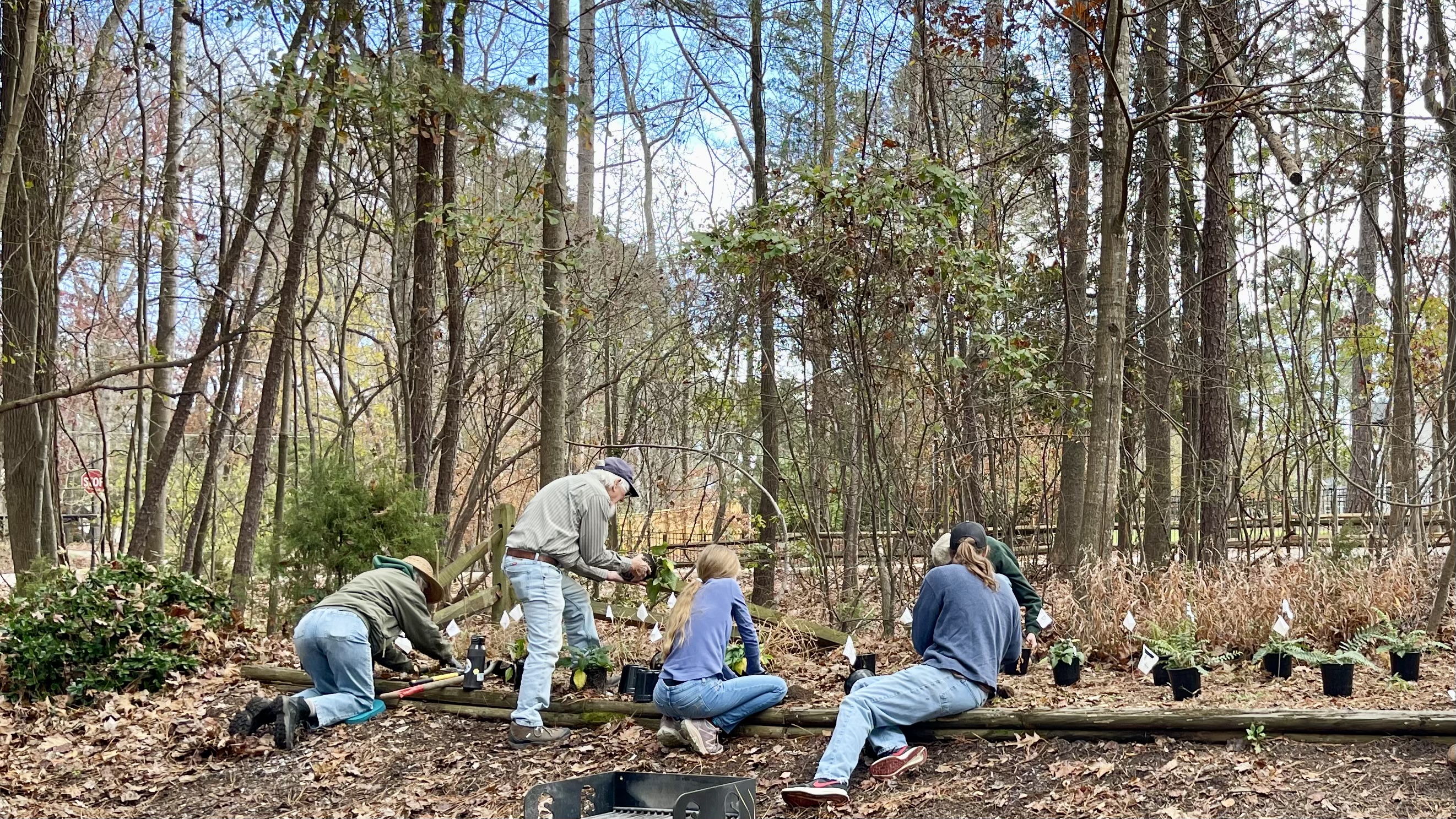 It seems a lot of folks were more than ready to get outside and have some “dirt therapy” after all the Thanksgiving feasting! Over twenty volunteers came to Bass Lake Park Sunday afternoon to refresh, plant, and mulch a multitude of new native plants in the SWC Native Shade Plant Demonstration Garden. Debra Quinlan and Sara Donohoe, co-leaders of the new Wildlife Gardens and Habitat Committee, took this garden to a new level. Sara designed a whole new landscape plan for the site, and Debra organized all the details of what to plant where with flags in advance of people arriving.