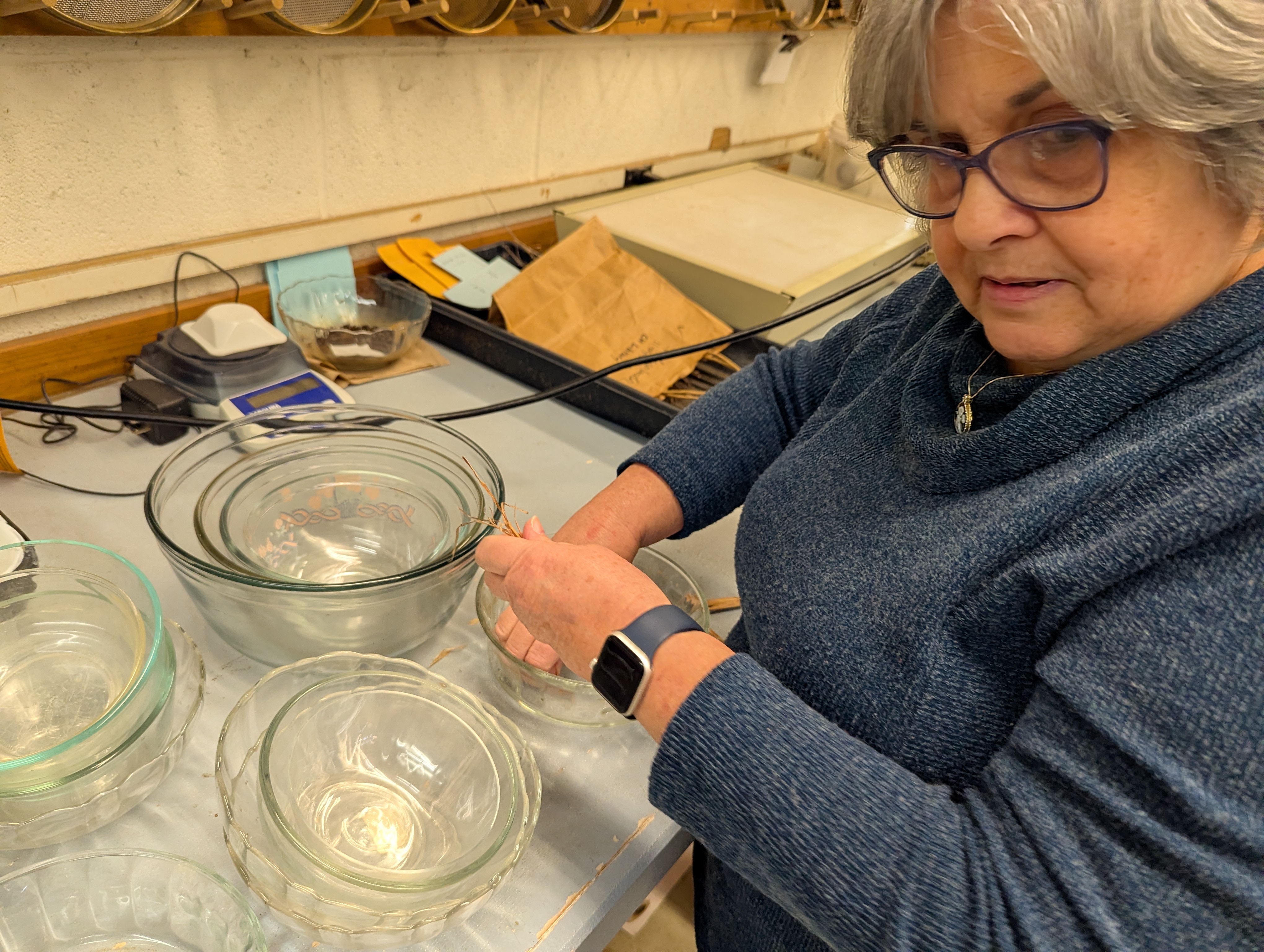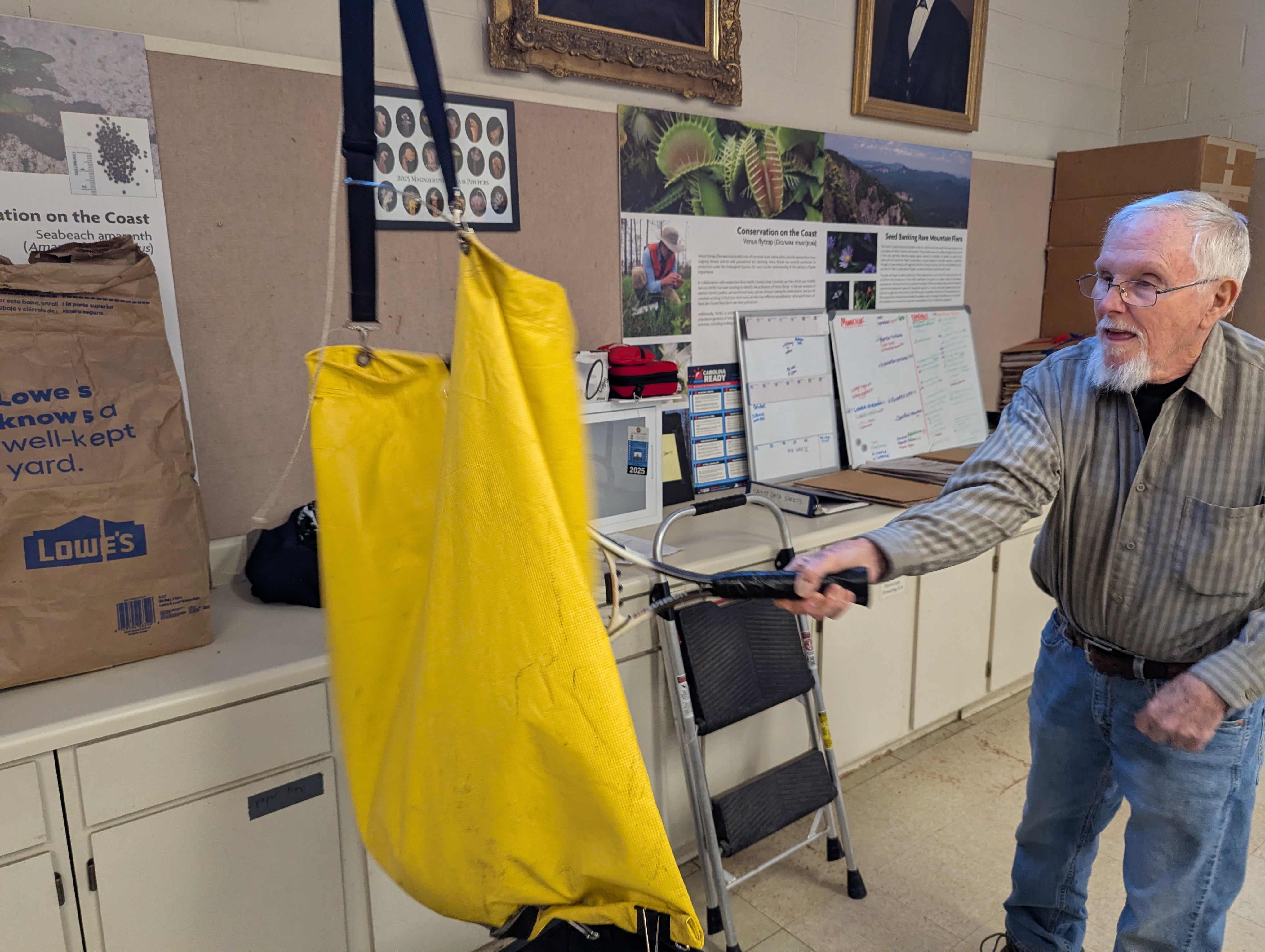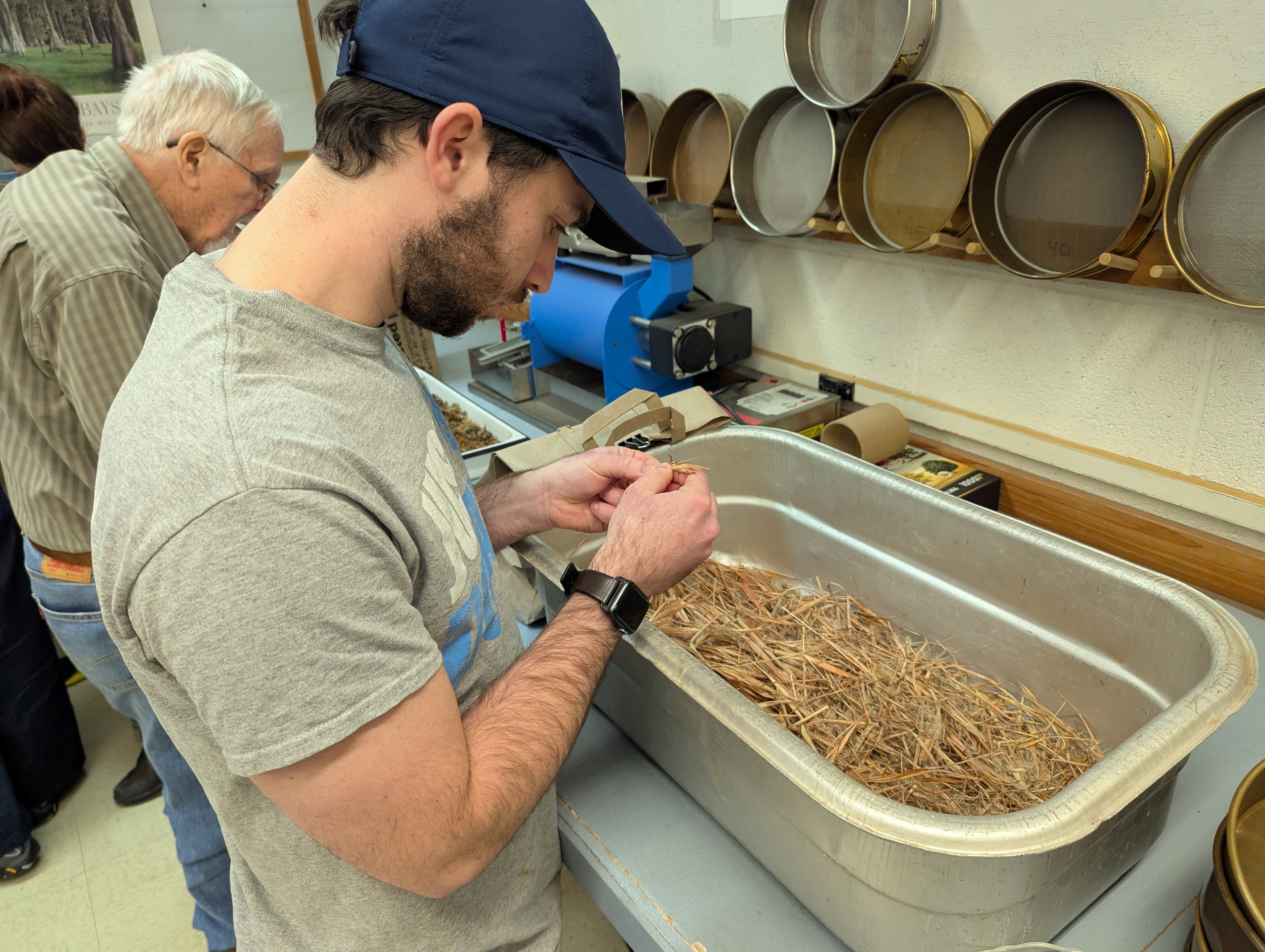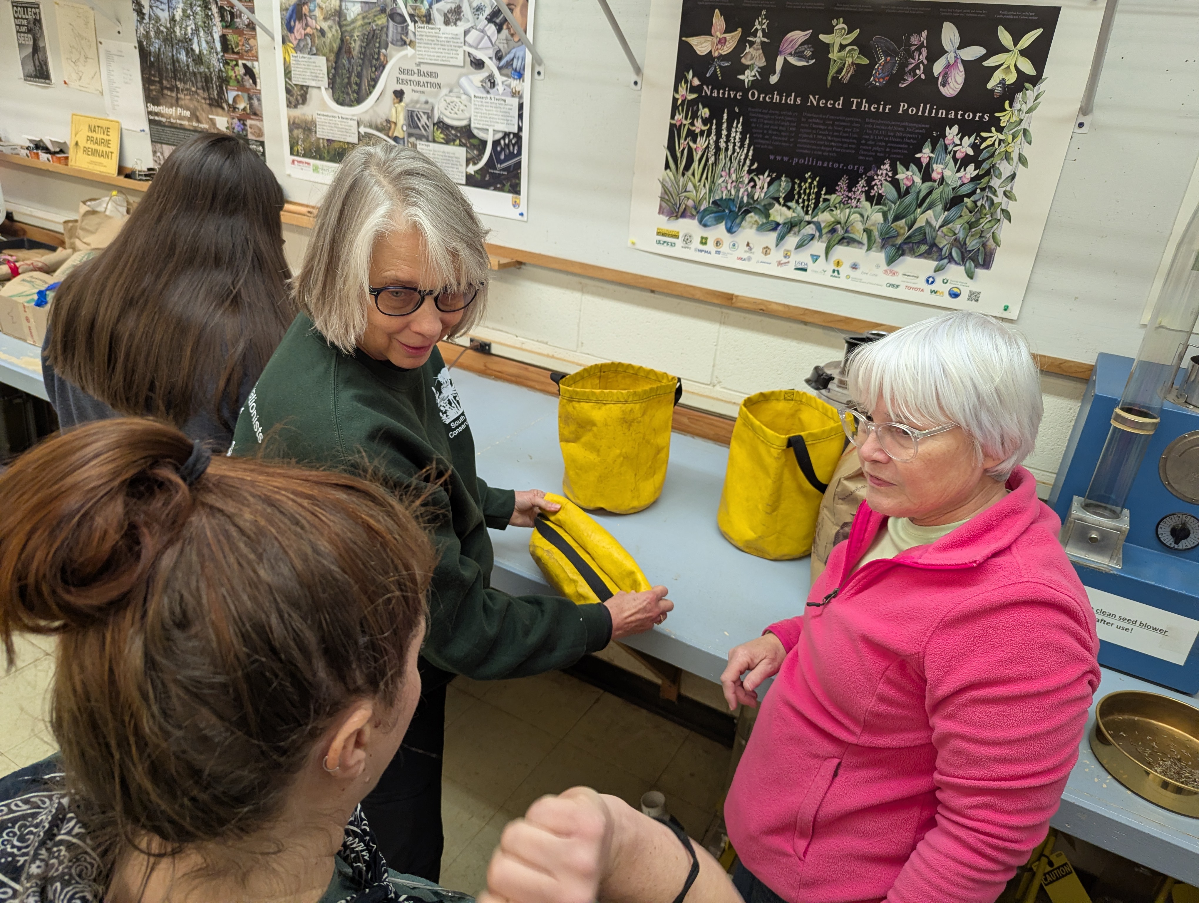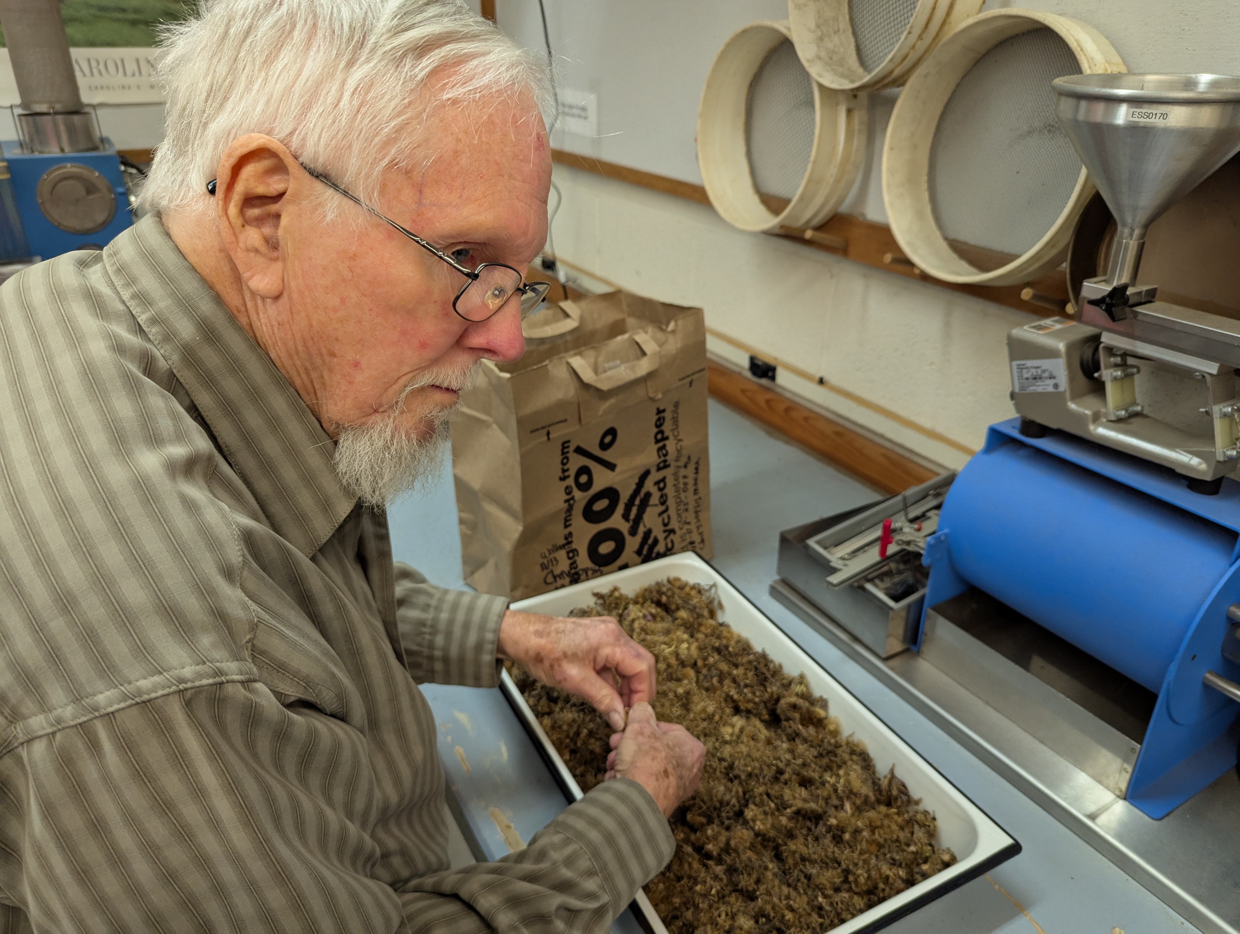 SWC joined forces with the Tri-County Conservationists Saturday morning to participate in a seed-cleaning workshop at the NC Botanical Garden in Chapel Hill. We first had a terrific orientation to the mission and operations of the lab by Conservation Grower Ali Touloupas, followed by hands-on use of various equipment and devices to separate the seeds of five different native plants they are helping to propagate in the NC Piedmont. We then toured the rest of the facility, including a freezer for long-term storage of carefully sealed and frozen seeds from a wide variety of plants under conservation, as well as dry storage in a climate-controlled room.