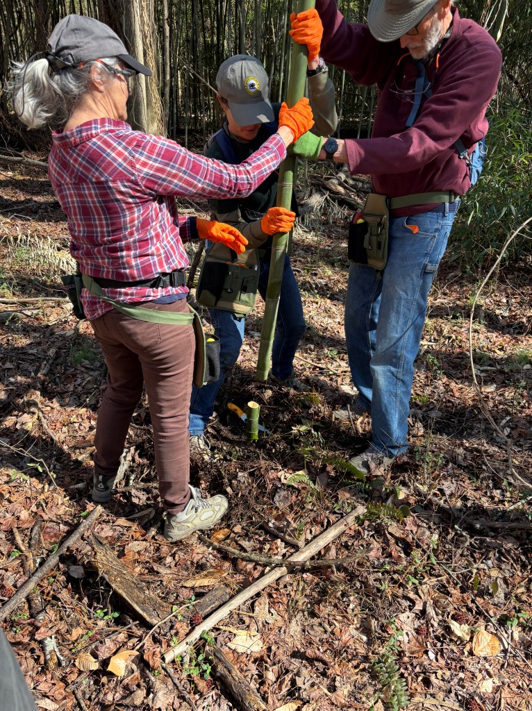 One of the park’s leaders, Angela Hawkins, taught us how to safely remove the tall stalks of bamboo. This involved two cuts, one for the top of the tree which won’t reroot and another at the base that will reroot. A small pruning saw was more than enough to cut the stem. The final step was to use a blotter to treat the base from regrowing. Within no time a large pile of stalks were created. Fortunately, we didn’t have the pleasure of dragging them up the hill to get them out, park staff will have that pleasure.