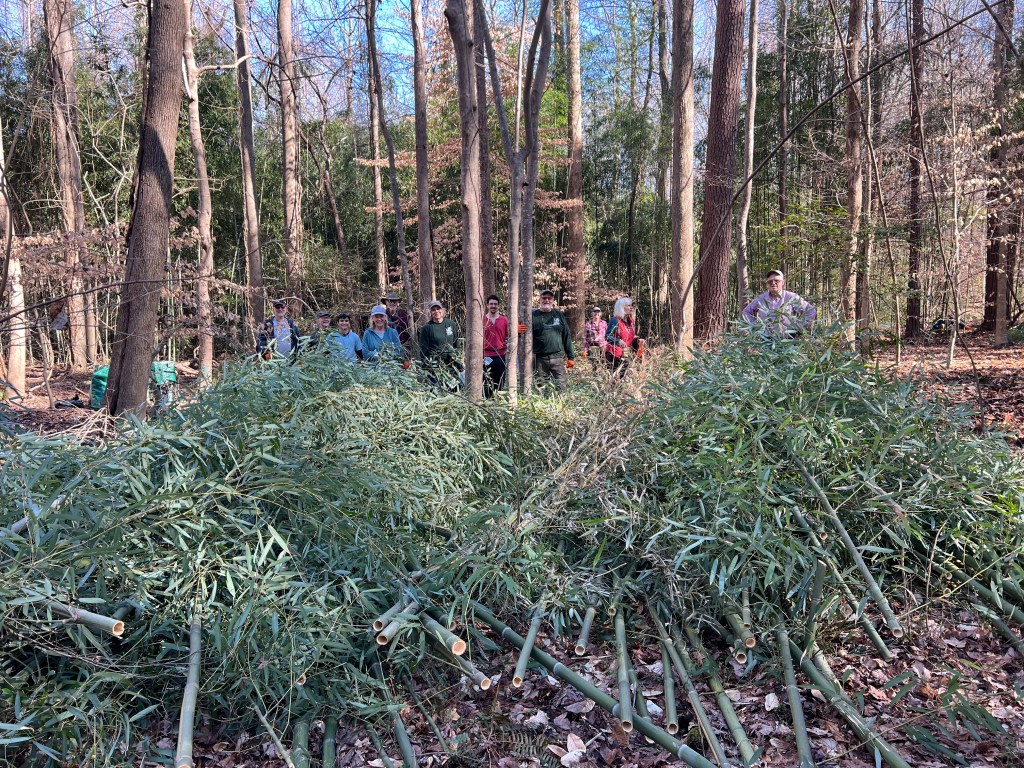 Members of South Wake Conservationists, along with the Hemlock Bluffs Strike team, tackled some well entrenched bamboo stalks, along with trifoliate orange and privet shoots, at this Natural Preserve run by the city of Cary and the state of North Carolina. This large “clump” of bamboo has been growing at the site for at least 70 years. They were unwittingly planted by the family that gave the property to the city, to help prevent erosion. Our team had to go off trail to find the bamboo, so it’s off limits to the public. We had to walk in a tight column to prevent damage to a large stand of ephemerals (mostly trout lilies) along the way. Some of the plants had delicate yellow flowers blooming, which provided us with a sample of what we will observe in our upcoming ephemeral hike!