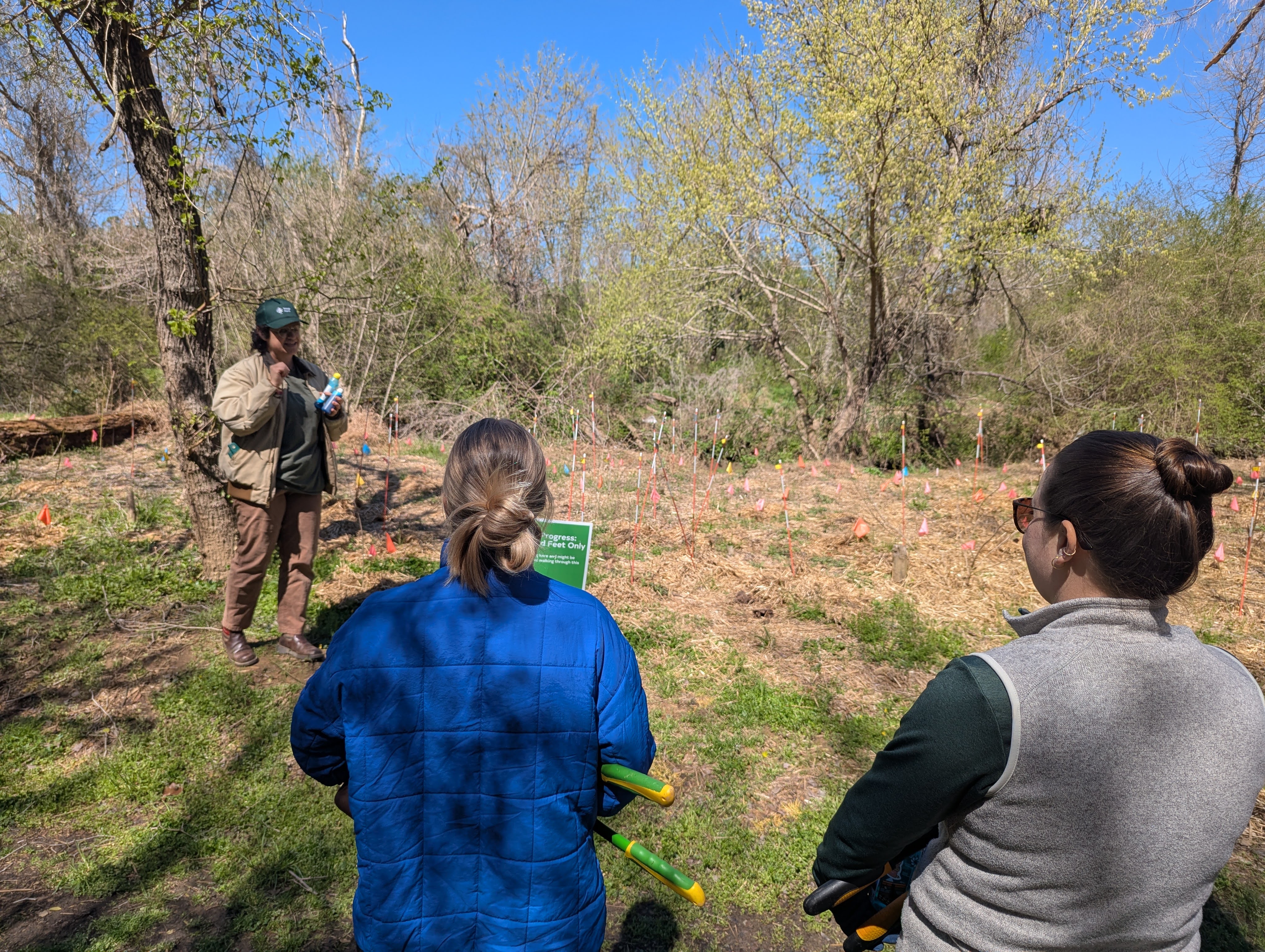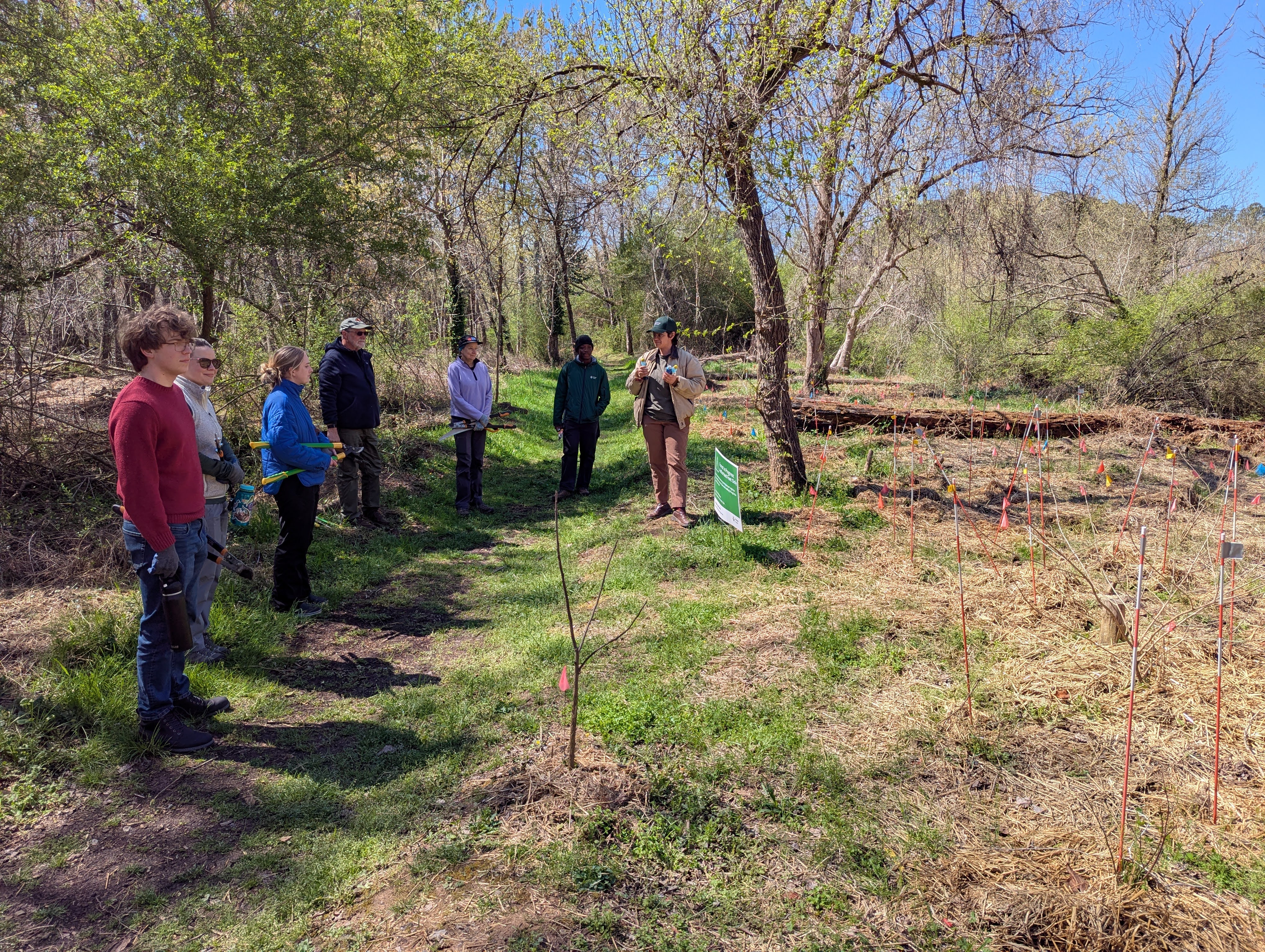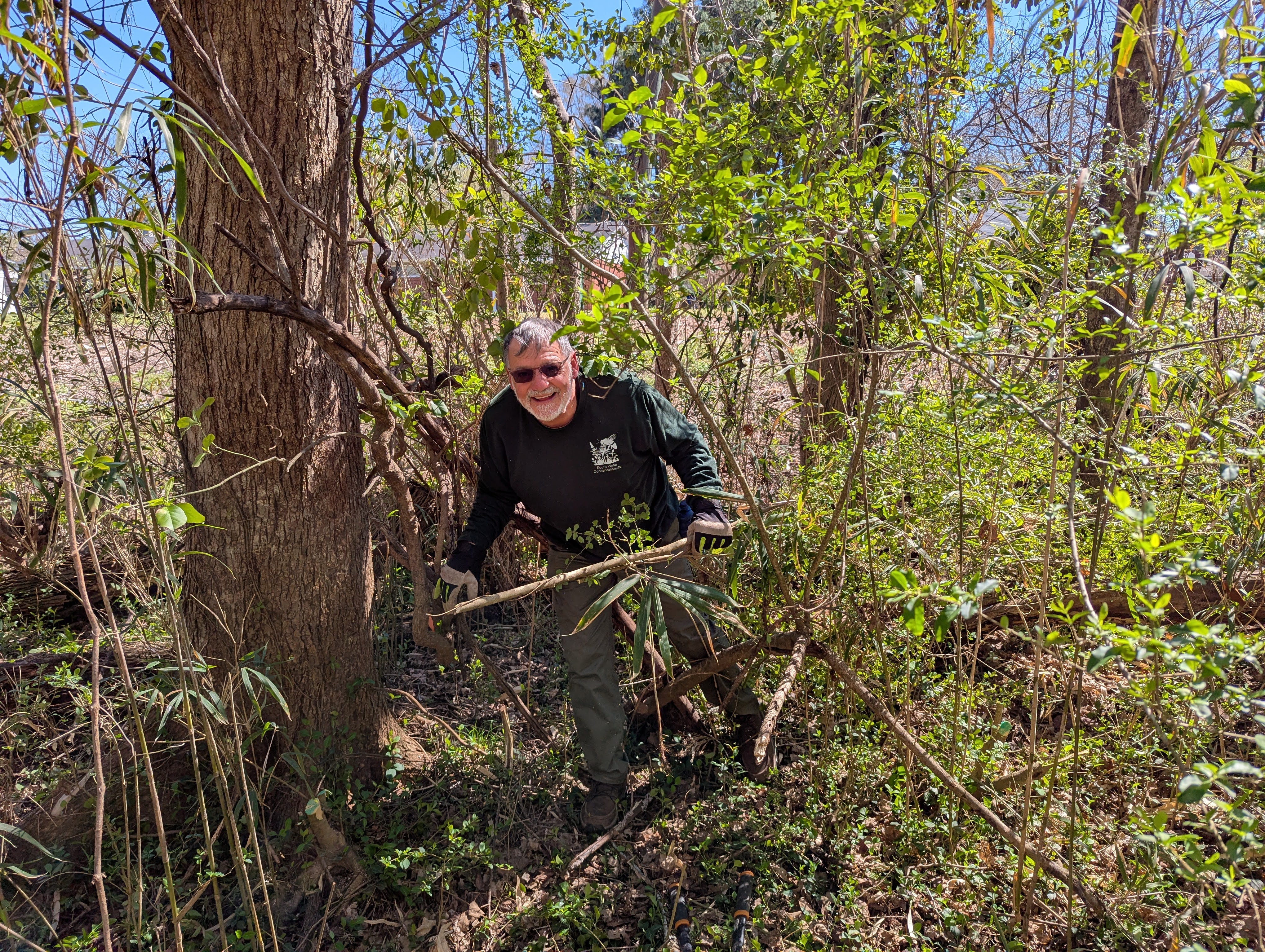 After delays due to freezing weather and a sick snake, our eager team of South Wake Conservationists, and volunteers from the NC State Dept. of Environmental Quality, were able to remove a canopy of mostly invasive plants to allow sun to shine on what we now know is native switch cane. The additional chlorophyll will allow the cane to grow and increase with rhizomes. Prior to our work Walnut Creek Asst. Manager Celia Lechtman brought us to a cleared area where her plan to randomly plant wetland shrubs should increase the bank stability for Walnut Creek.