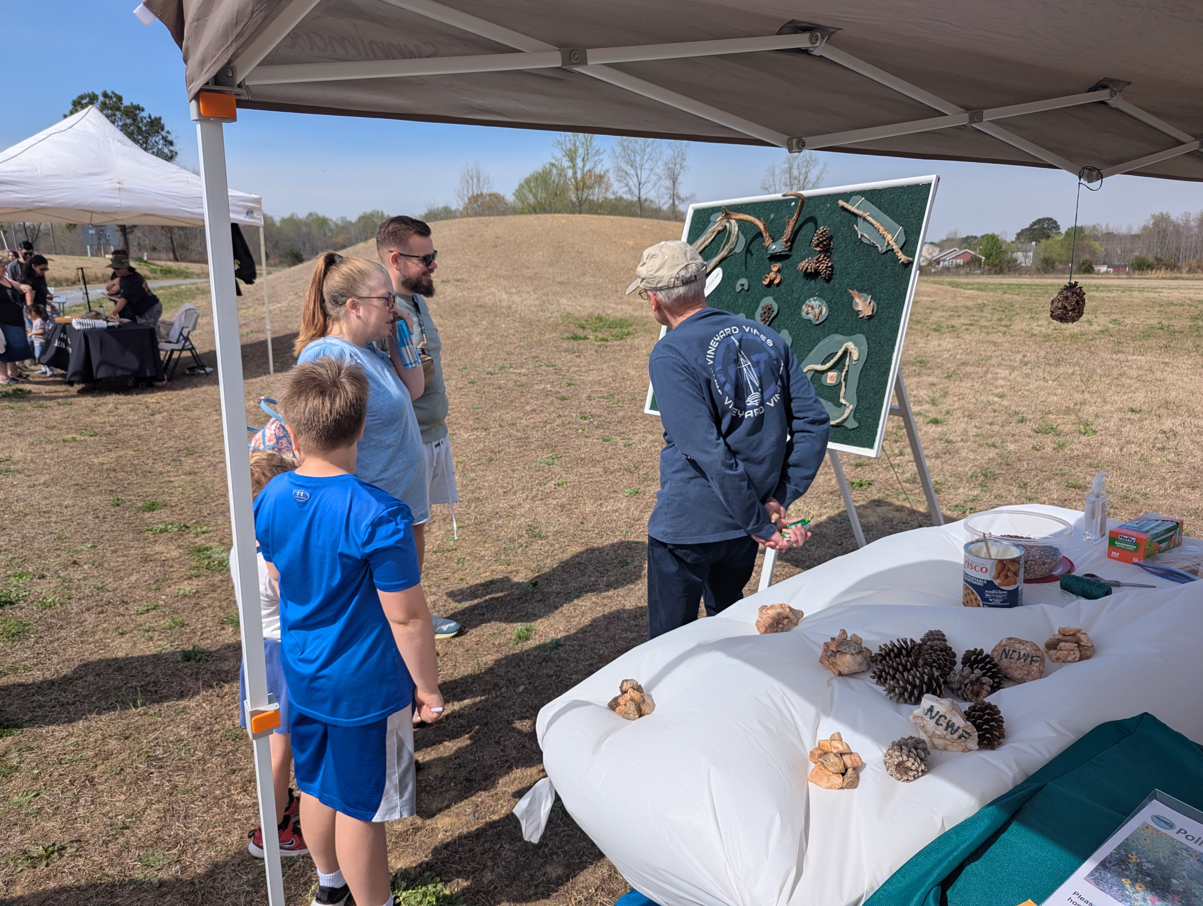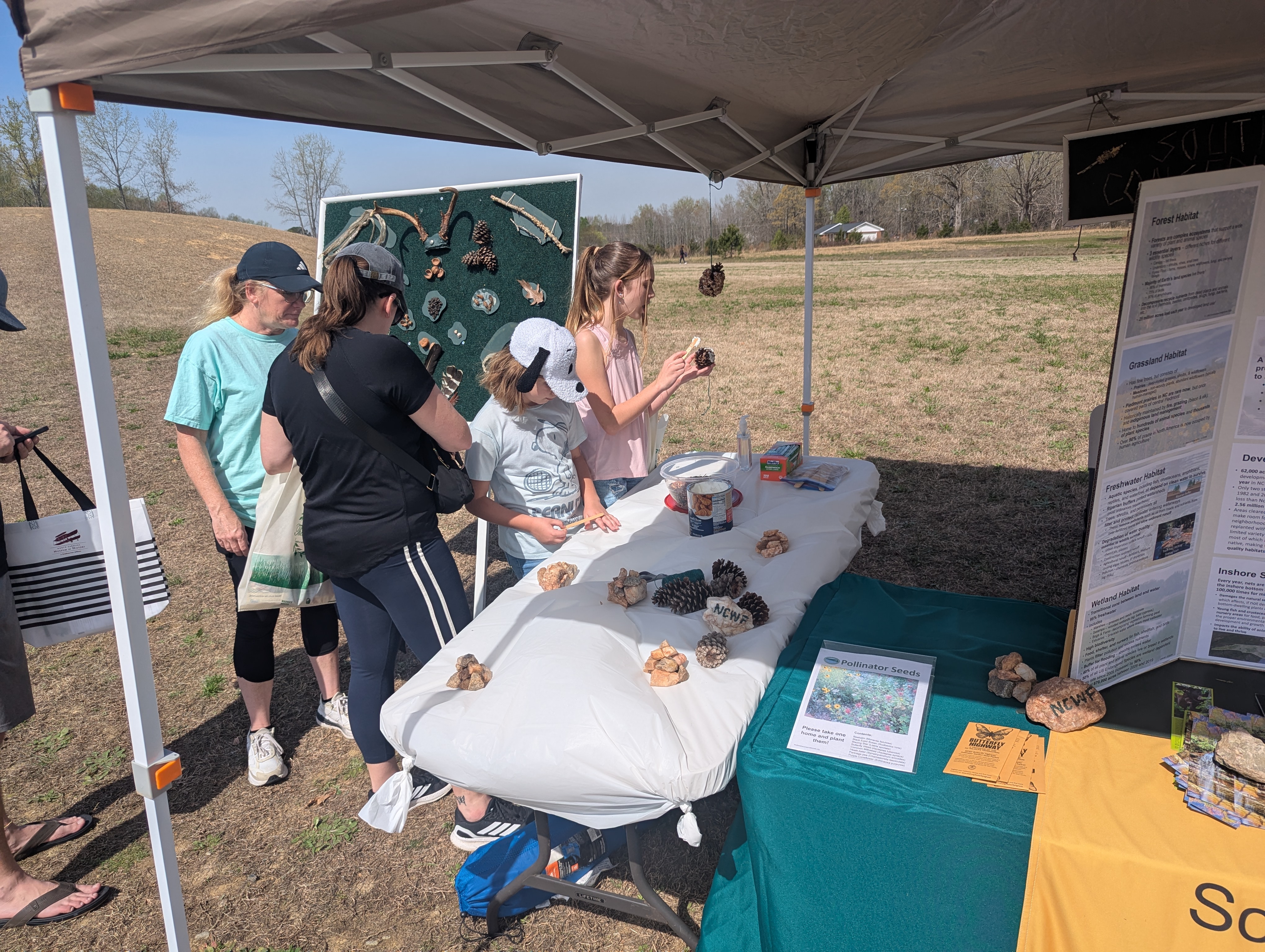 Our theme this year is “Wildlife Habitat.” We had our custom-designed nature board on display, as well as our classic nature trivia challenge with the Q&A board for everyone to test their nature knowledge. The kids had fun making pine cone feeders, and we even ran out of Crisco for the substrate and had to run to the store to buy more! They also got to try their luck guessing animal sounds with our sound button array.