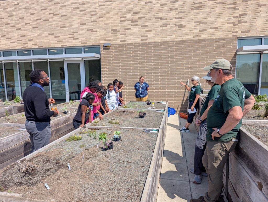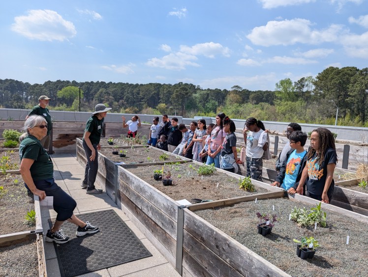 The SWC Eco Kids project to launch a sustainable garden program on the roof of the Southeast Raleigh Elementary School kicked off its first hands-on session with 25 fourth and fifth-grade students Friday, just before their Spring break. The team had been working well in advance, planting a variety of pollinator plants and seeds in eighteen raised bed boxes around the perimiter of the rooftop area, as well as cleaning up and relocating plants in the sixteen boxes in the middle, which are being adopted by student teams. These will provide living examples of the beneficial effects of pollinator plants and the pollinators they attract and support.