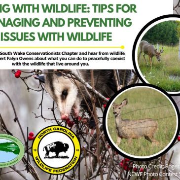 Providing backyard habitat is a great way to support local wildlife, but what do you do when wild animals make themselves too at home on your property? Join NCWF South Wake Conservationists Chapter and hear from wildlife conflict expert Falyn Owens about what you can do to prevent common issues, manage the ones already you … More Living with Wildlife: Tips for Managing and Preventing Issues with Wildlife