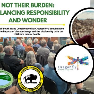 Join NCWF South Wake Conservationists Chapter for a conversation about the impacts of climate change and the biodiversity crisis on children’s mental health. Hear from a local environmental educator, Rachel Woods, about how her ecophilic educational model serves as a buffer for children against environmental angst. Rachel Woods is a certified Environmental Educator and owner/lead … More Last Meeting of the Year! Not Their Burden: Rebalancing Responsibility and Wonder